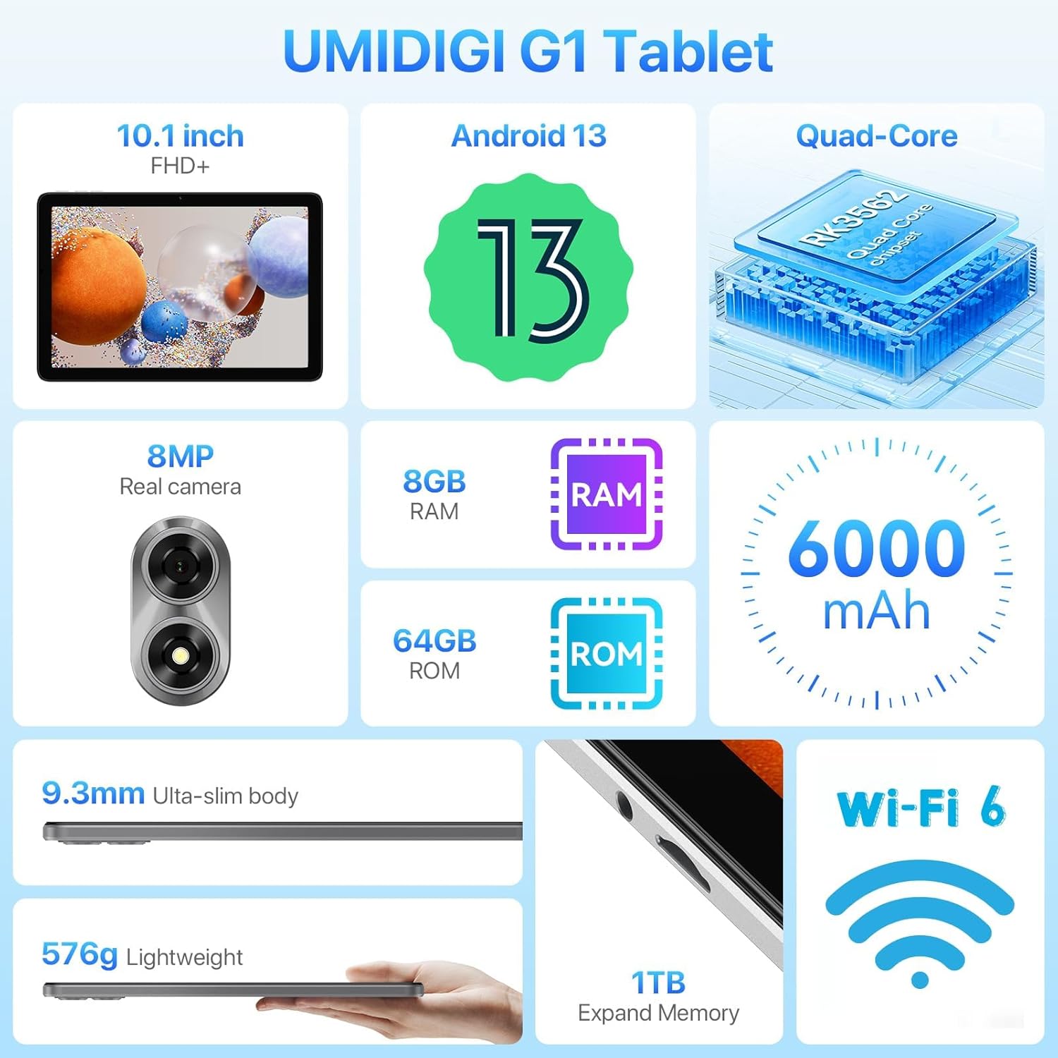 8GB+64GB/1TB TF Expansion: With a massive 4GB+4GB extended RAM and 64GB ROM memory,1TB TF Expansion, UMIDIGI G1 Tab tablet offers a seamless storage experience. The ample capacity allows for storing numerous songs,photos, files, and videos simultaneously without any concerns.Max Capacity, More Fun with G1 Tab tablet.