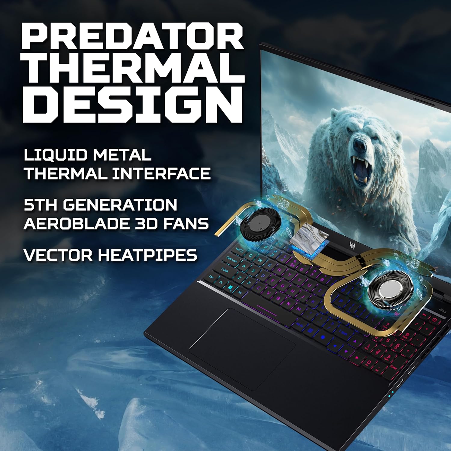 PREDATOR COOLING: Liquid Metal thermal grease, Vector Heatpipes and a custom-engineered AeroBlade 3D fan combine to keep this immensely powerful laptop running cool and quiet
