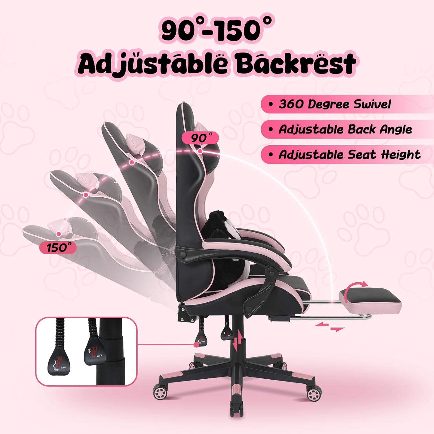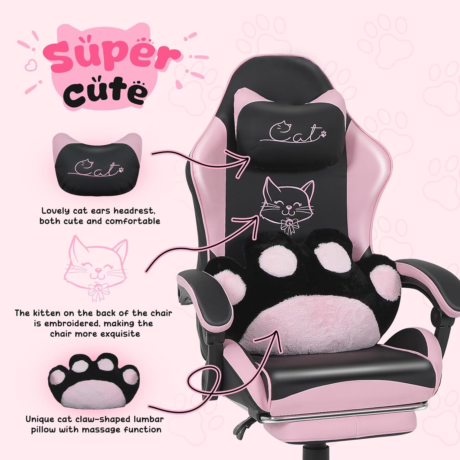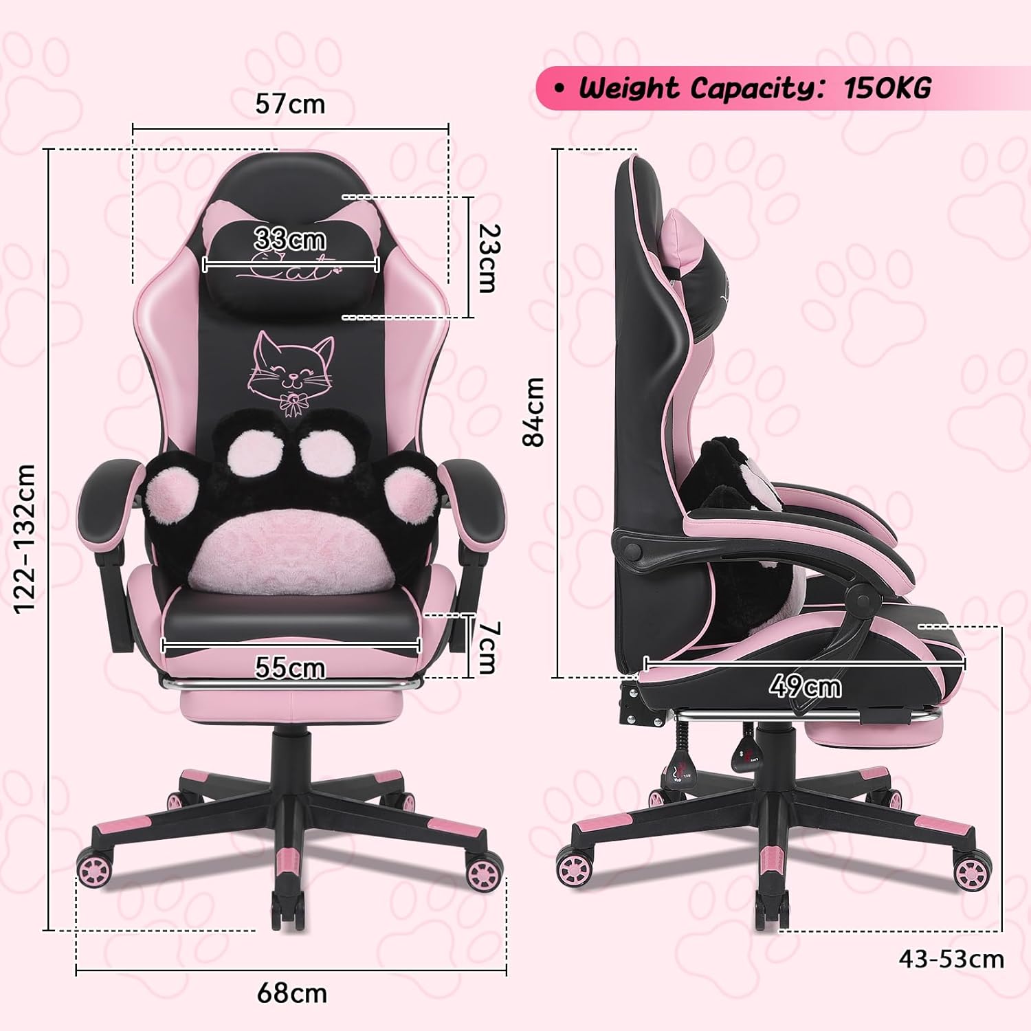 CUTE CAT DESIGN: This PC gaming chair is uniquely designed in a black and pink colour scheme, with our uniquely designed cat head on the backrest and beautifully embroidered cats on the headrest, these beautifully adorable touches add a touch of playfulness to the chairs.