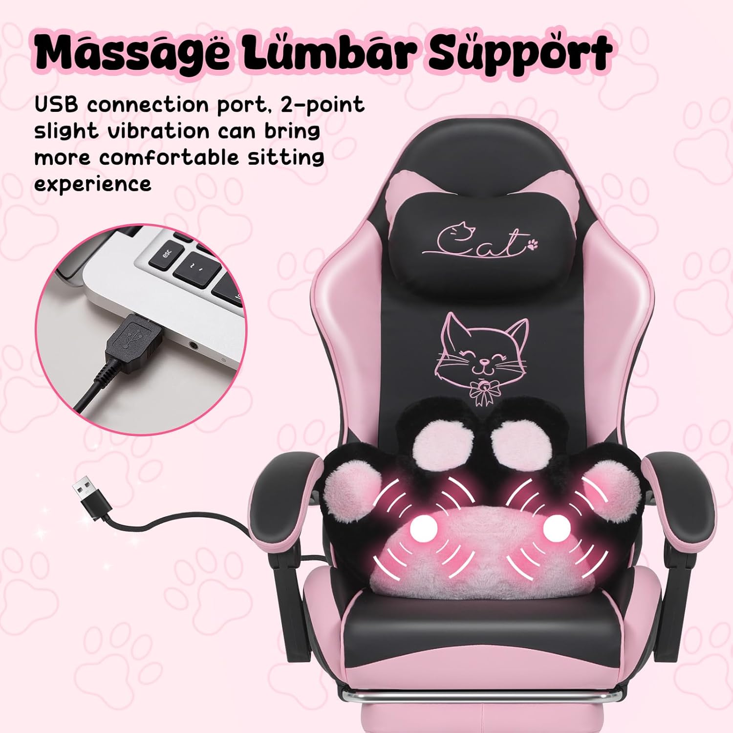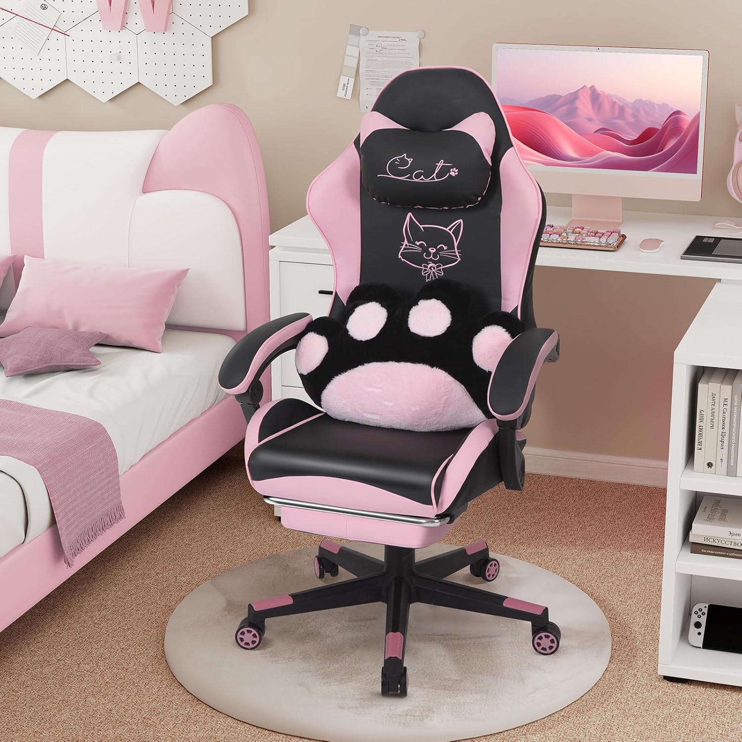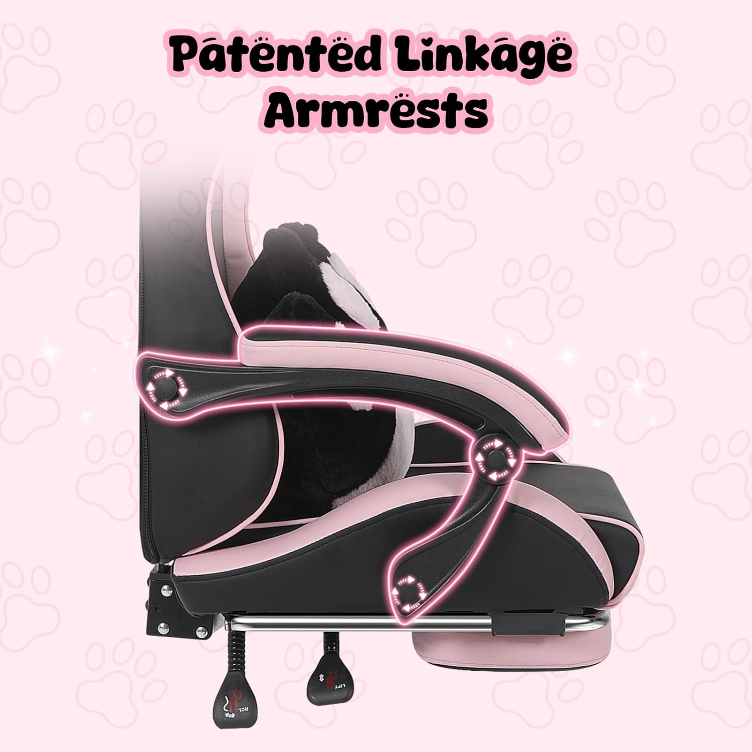 CUTE CAT DESIGN: This PC gaming chair is uniquely designed in a black and pink colour scheme, with our uniquely designed cat head on the backrest and beautifully embroidered cats on the headrest, these beautifully adorable touches add a touch of playfulness to the chairs.