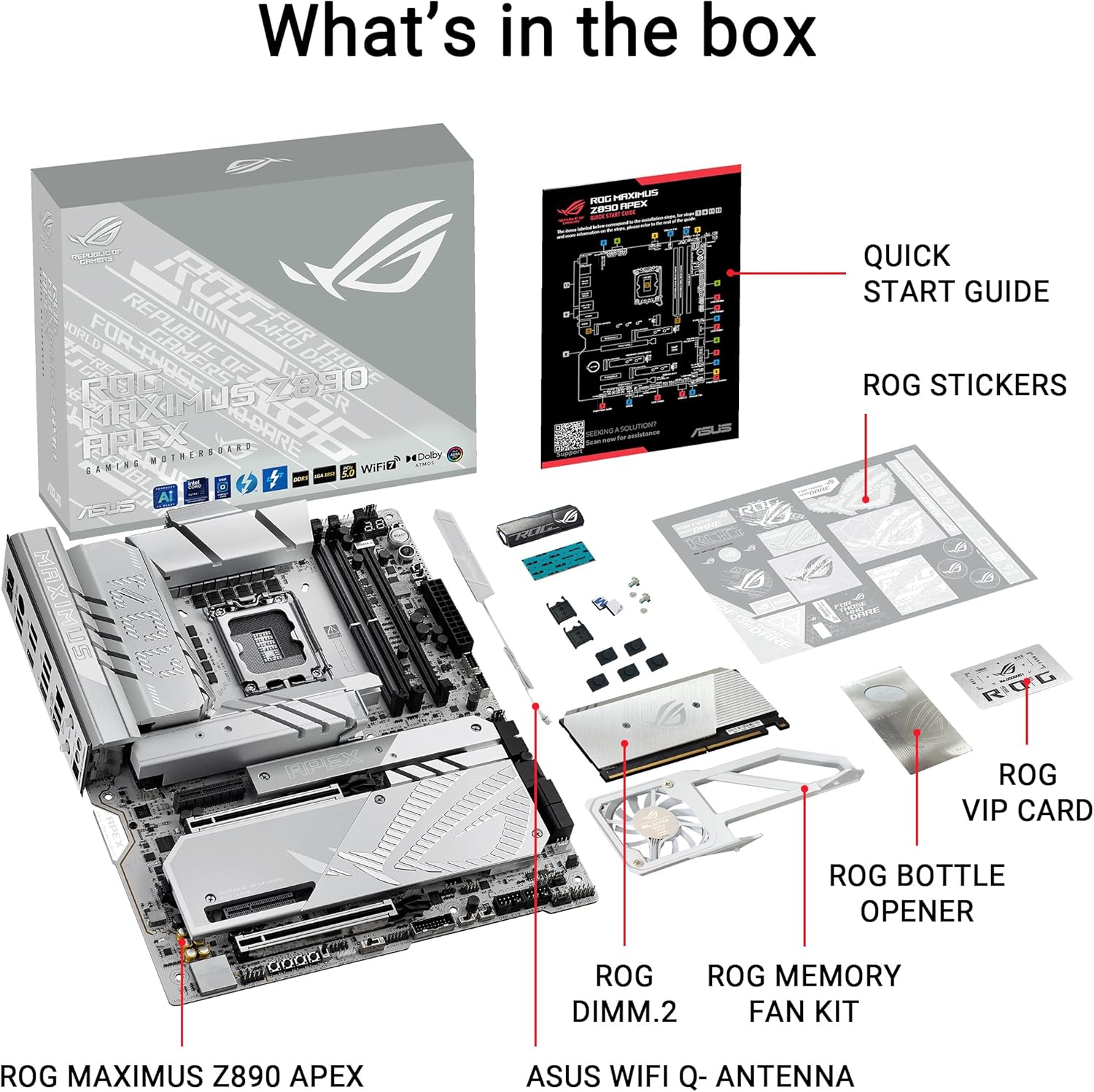 ASUS ROG MAXIMUS Z890 APEX Intel® Z890 LGA 1851 ATX motherboard, Advanced AI PC-ready, 22+2+1+2 power stages, DDR5, WiFi 7 with ASUS WiFi Q-Antenna, three PCIe® 5.0 M.2, ROG DIMM.2 card, PCIe Slot Q-Release Slim, Thunderbolt 4, USB Type-C®, ASUS AI Advisor, AI Overclocking, AI Cooling II, AI Networking II