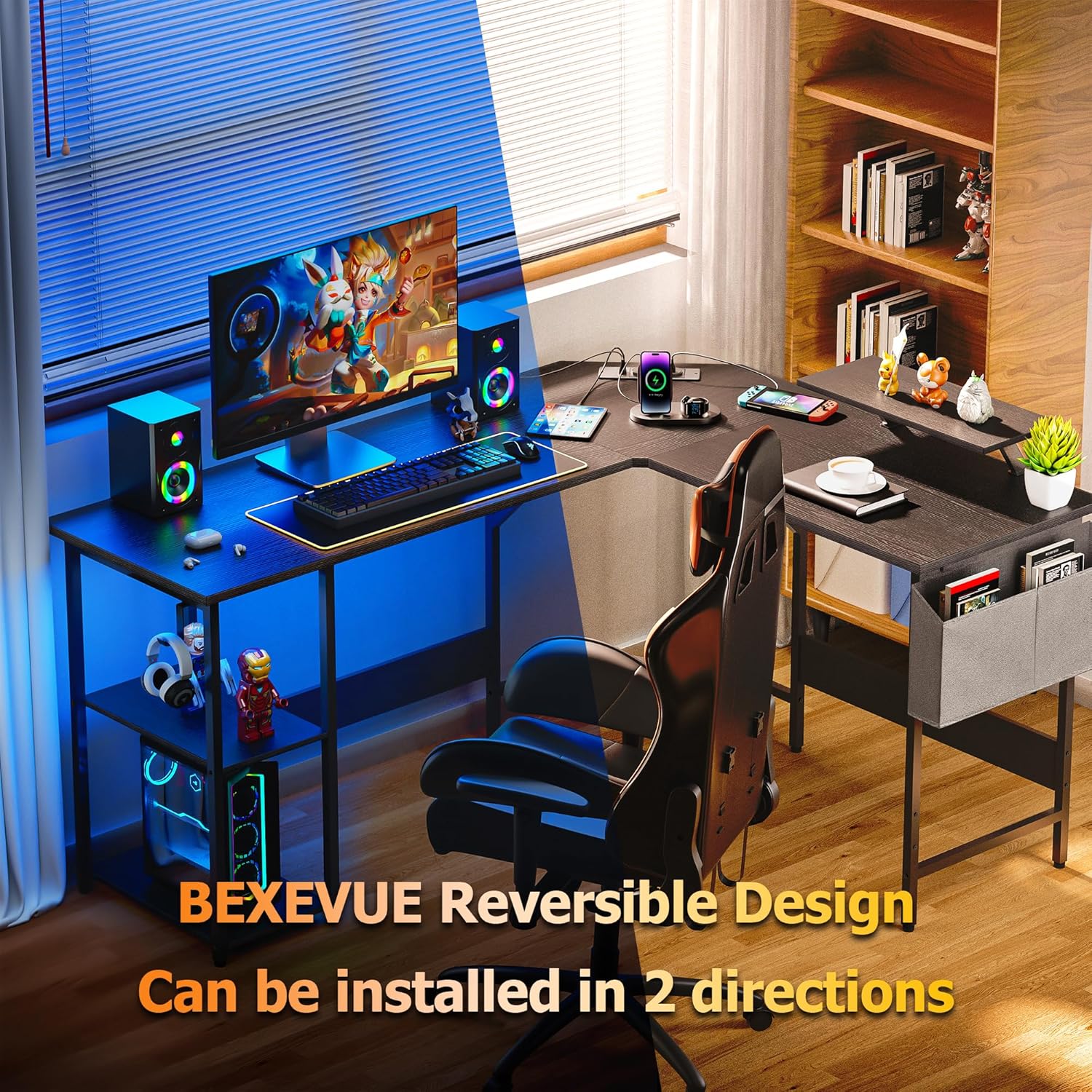 Modern Design with Power Strip: BEXEVUE L-shaped modern desk unifies rigid metal with particle board, 2 outlets, 1 USB and 1 Type-C power strip, giving a unique look of delicate charm. The cord length is 1.5 meters. Get rid of tedious cable clutter and keep your desktop neat and tidy.