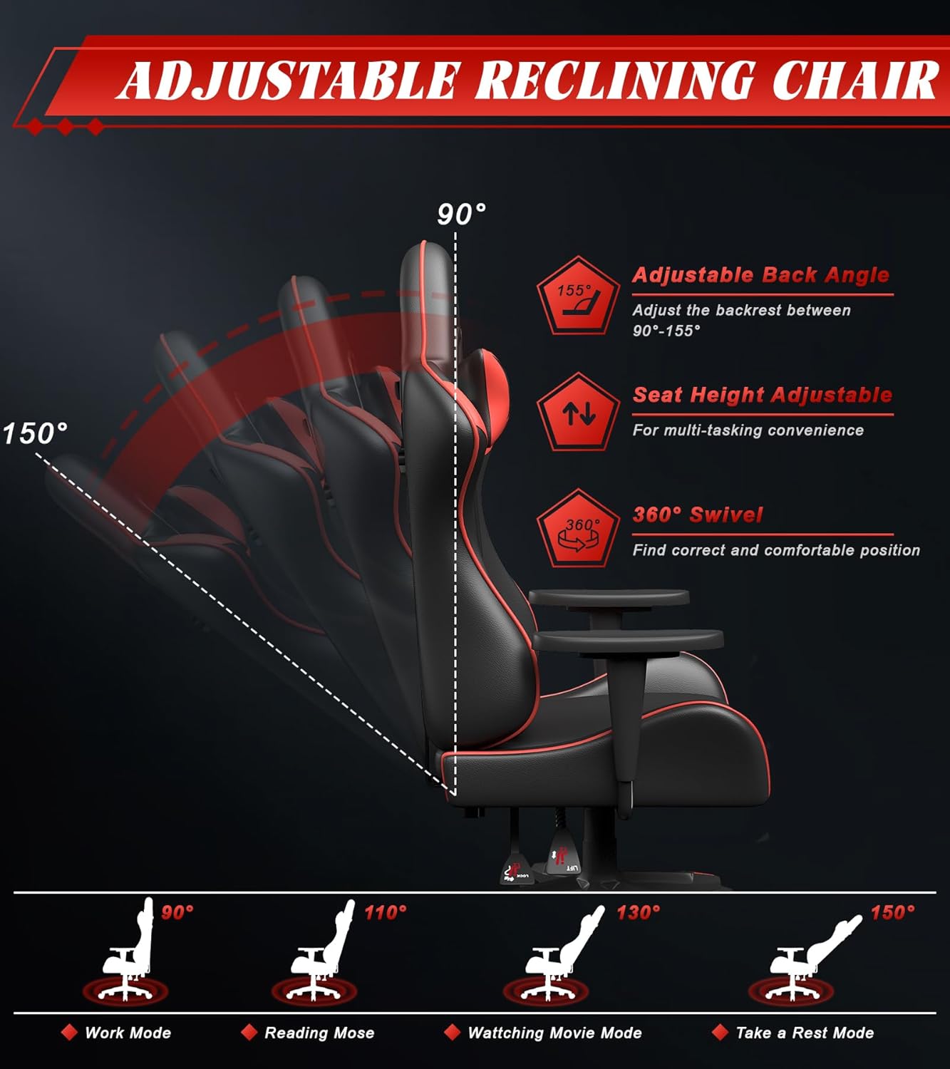 Height And Tilt Adjustment: The height of the chair can be adjusted from 124cm-134cm, specially fit for for desks of different heights. The angle can be adjusted from 90°- 155°based on your needs. Just need to press and hold adjustment button, you can choose to play games, work or nap.