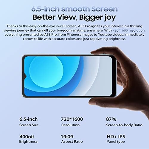 ★【6.5-inch smooth Screen, Better View, Bigger joy:】Thanks to this easy-on-the-eye in-cell screen, A53 Pro ignites your interest in a thrilling viewing journey that can kill your boredom anytime, anywhere. With 720*1600 resolution, everything presented by A53 Pro, from Pinterest images to Youtube videos, immediately comes to life with accurate colors and just captivating brightness.