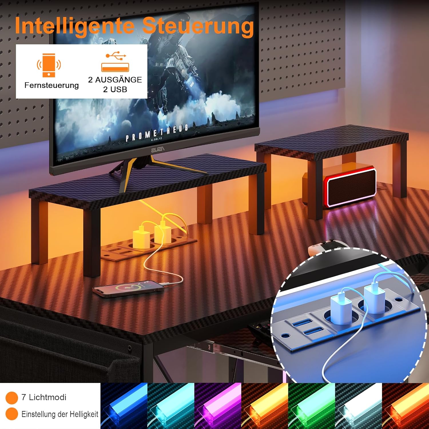 【Gaming Table with LED Lights and Power】This gaming table offers an impressive LED light setup with 20 colours, 21 light modes and adjustable brightness, simply choose your favourite colour and mode and enjoy an immersive gaming experience. Our L-shaped gaming table comes with 2 AC outlets and 2 USB charging ports to power up to 4 devices simultaneously. There is no need to place additional power outlets on the table, making it extremely convenient for gaming or home office use.