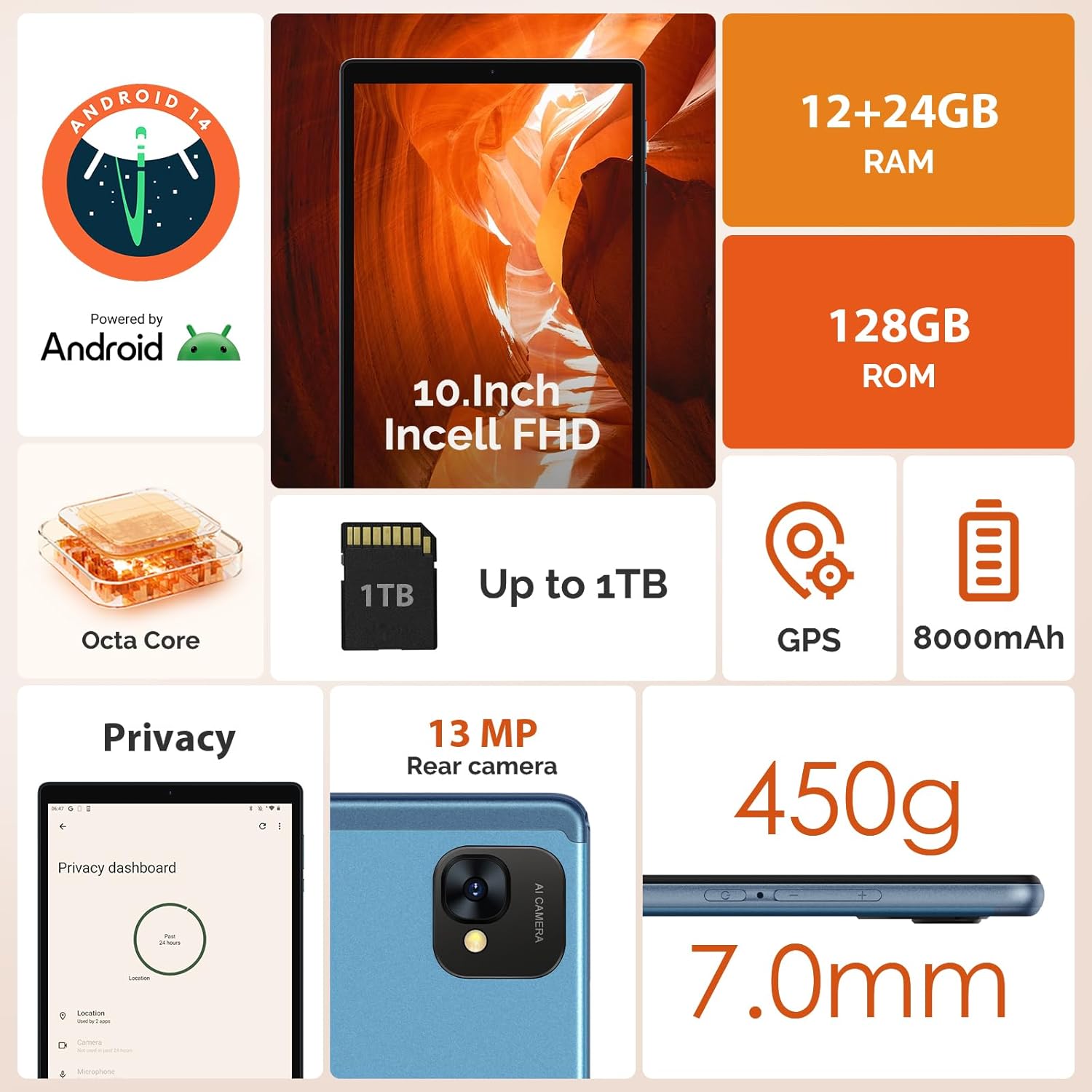 ć36(12+24)GB RAM+128GB ROM+1TB ExpandablećFLYCOAY Tablets are equipped with 12GB super RAM memory, enable RAM expansion technology, you can expand the RAM up to 36GB, running speed increased by 60%, whether you are playing games or working, Android 14 Tablet can give you a smooth experience. 128GB of storage space is enough to store your favorite movies, photos and apps and with a TF card slot and 1TB of expandable storage.