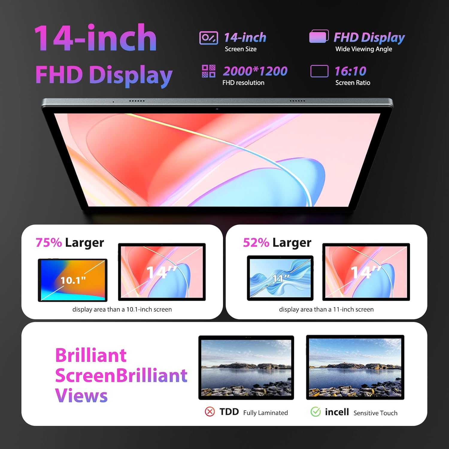 13MP rear camera+8MP front camera+14 inch Incell FHD Screen:The 13MP main camera captures rich details and delivers clear, detailed images suitable for high quality photos.The 8MP camera provides an additional viewing angle or can be used for specific functions such as wide-angle shooting or depth perception.The 14 inch Tablet PC with Incell large screen technology can provide thin and light design, high display effect, accurate touch experience, and smoother touch experience due to the close integration of the touch layer with the display, which reduces the possibility of misoperation