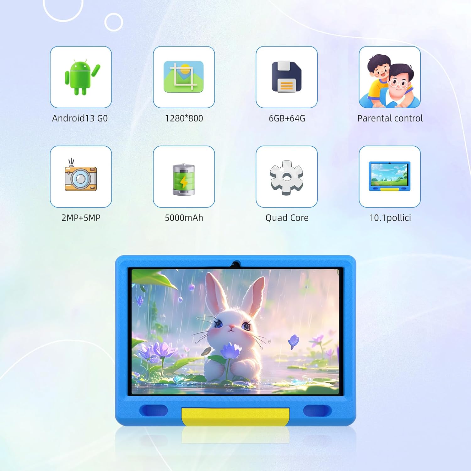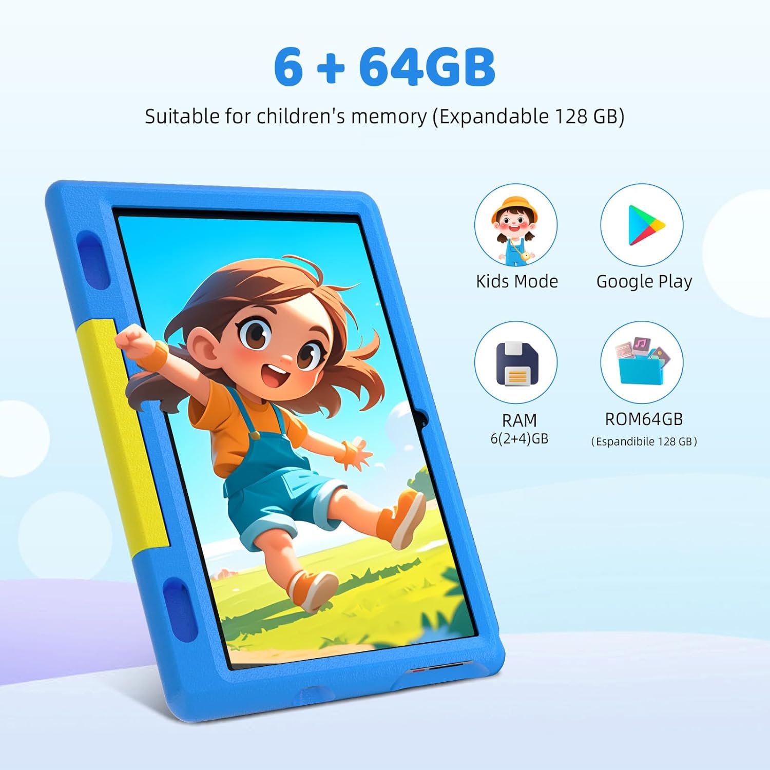 FYMLCPFY Kids Tablet,Tablet for Kids 10 inch Android 13 Quad-Core Toddler Tablet,Parental Control, 6(2+4) GB RAM+64GB ROM+128GB SD Expansion,5000 mAh,1280 * 800 HD display,WiFi,Bluetooth (Blue)