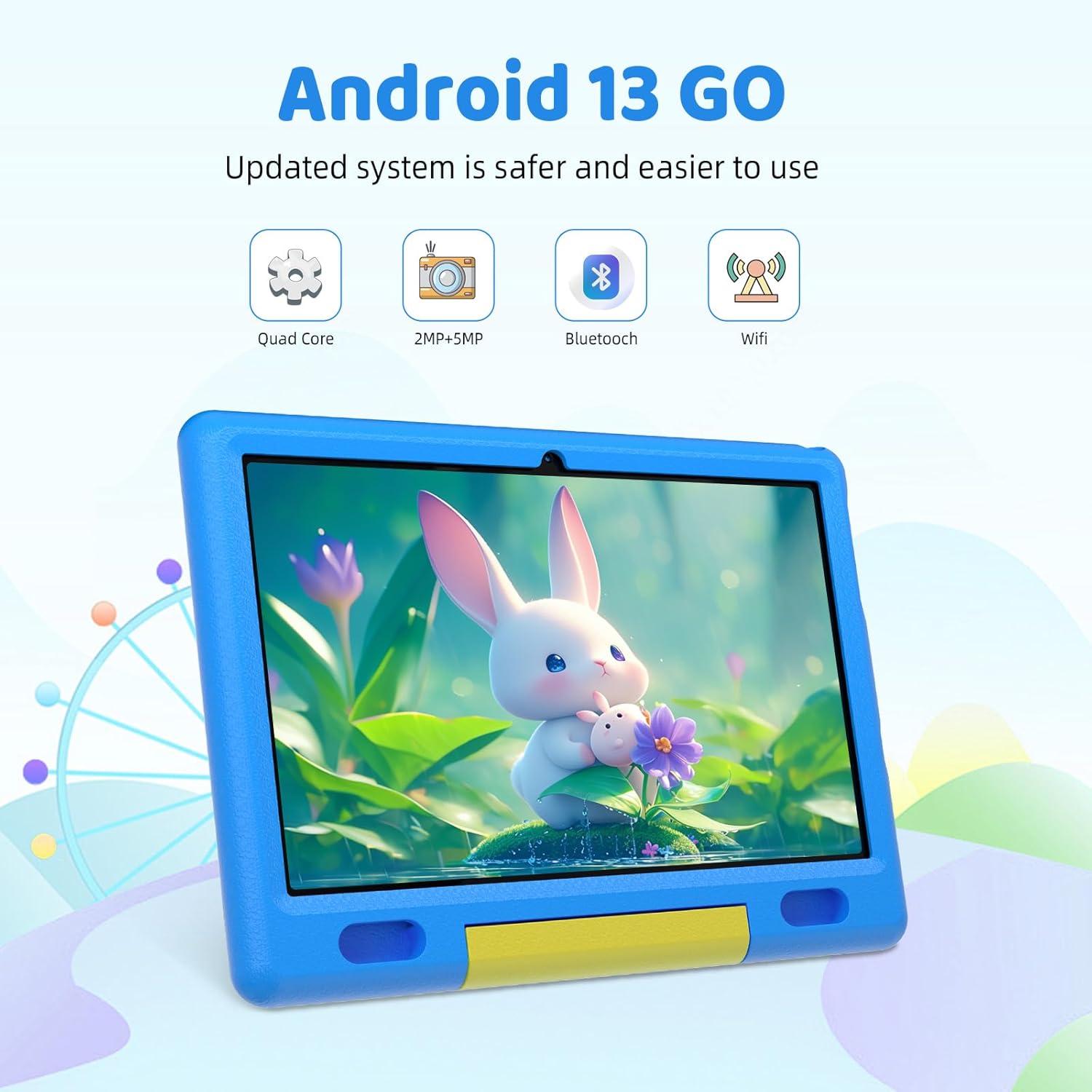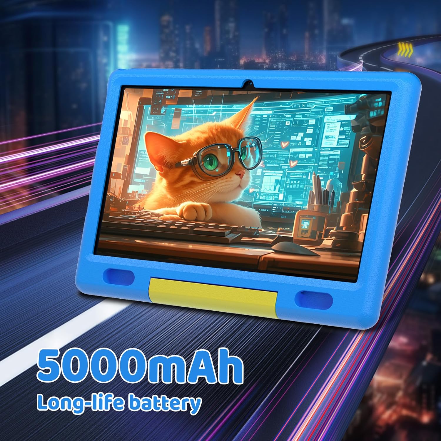 【Android 13 Kids Tablet】This kids tablet, powered by a robust Android 13 operating system and a quad-core processor, offers a smoother operation. With 6GB RAM and 64GB storage (expandable up to 128GB), it allows children to store more videos, photos, and music. Additionally, the tablet for kids is equipped with a large-capacity 5000mAh battery, which can last approximately 6 to 9 hours depending on usage.