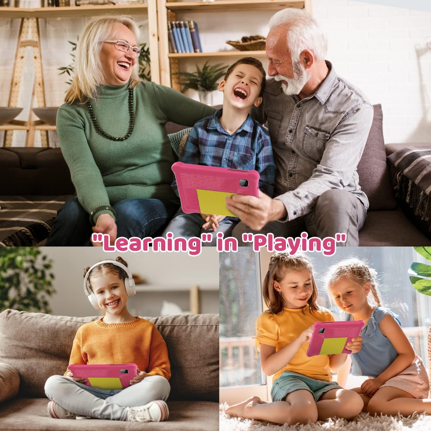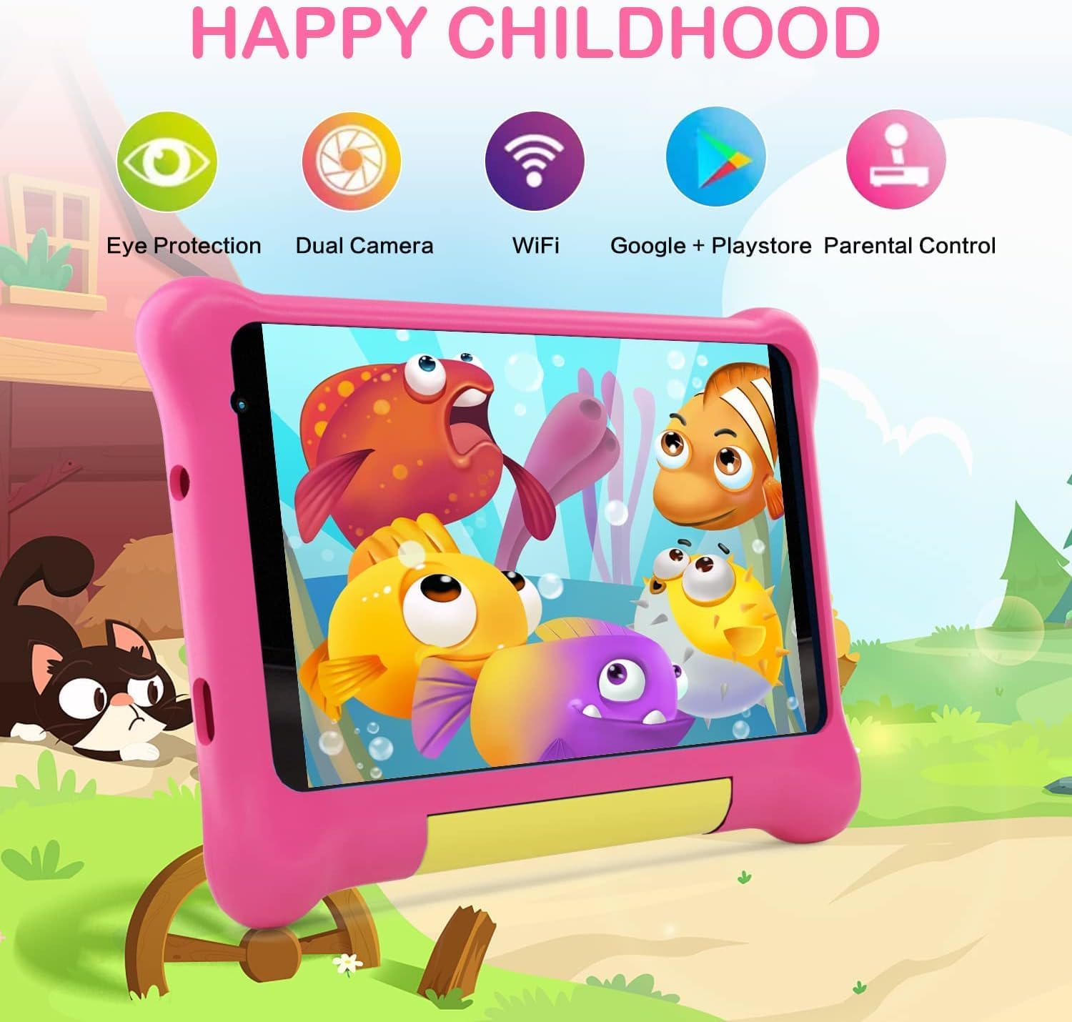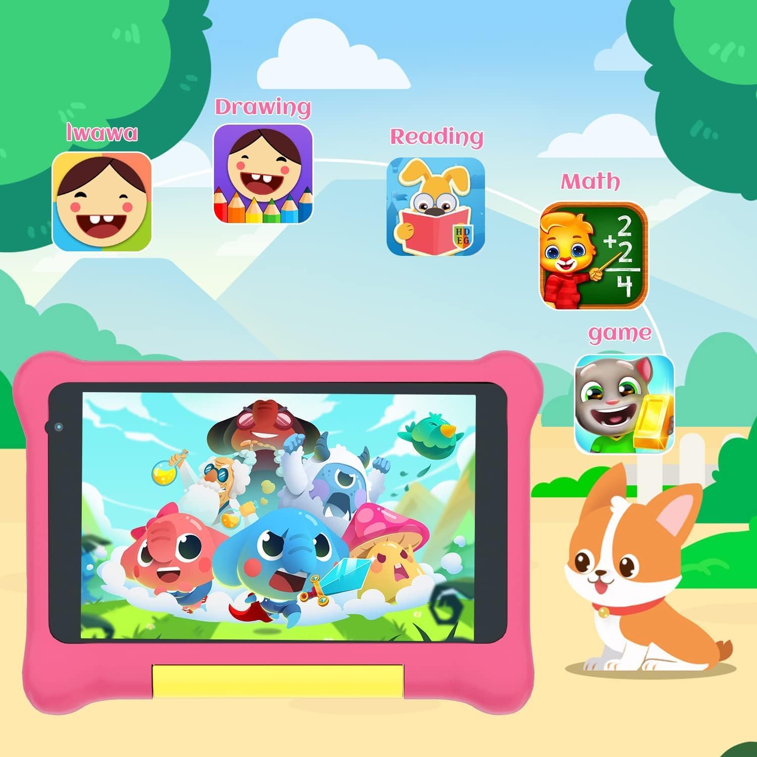 The 7 inch tablet for kids comes with 1024×600 IPS HD screen, designed with low blue light technology, high contrast, wide viewing angle, provides outstanding visual experience from all angles. This tablet kids automatically adjust the brightness to minimize damage children’s eyes. Children can be wander in the ocean of the knowledge.
