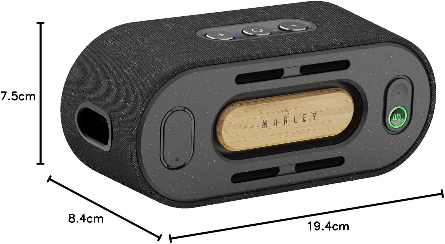 SUSTAINABLY CRAFTED: Upholding House of Marley’s message, this small sized wireless Bluetooth speaker is crafted from natural bamboo, REWIND fabric, REGRIND silicone & aluminium 100% plastic free & recyclable packaging