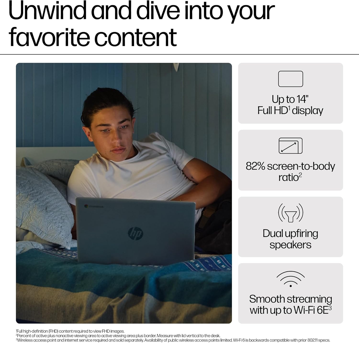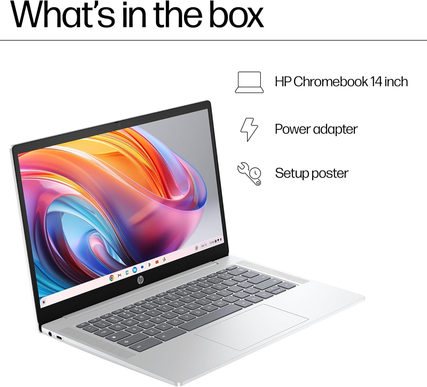 WORRY-FREE PERFORMANCE AND ENTERTAINMENT: Stay productive and worry-free with the HP Chromebook 14”, packed with the performance of an Intel N100 processor and the easy to use Chrome OS. Do more with plenty of memory, faster speeds, and wireless connectivity and enjoy faster boot and long battery life with HP Fast Charge so you can stay connected all day.