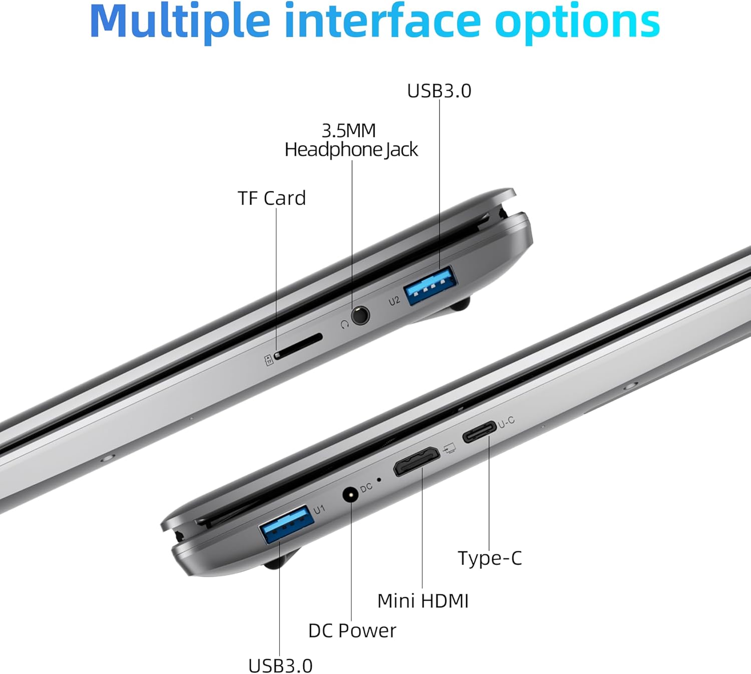 Multi-functional Ports: The laptop comes with Type-C port x 1, 3.5mm headphone jack x 1, Mini HDMI × 1, USB 3.0 port x 2, Micro TF slot x 1, Quick Charger DC port