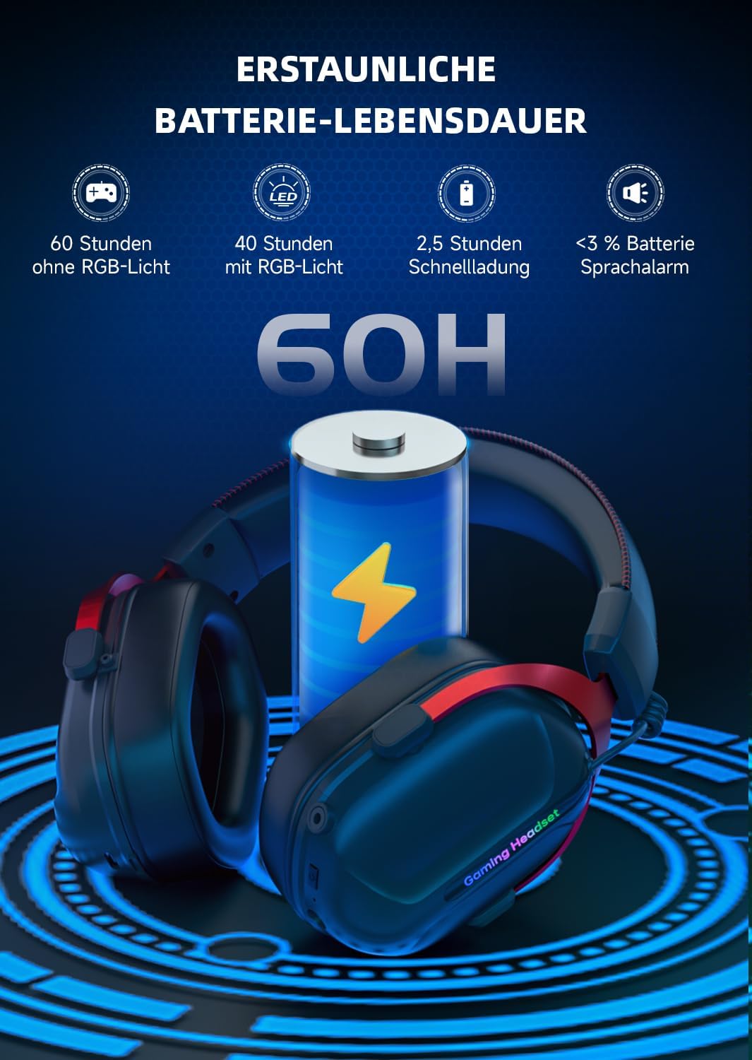 【EQUIPPED WITH SUPER POWERFUL ATS3031 CHIP TECHNOLOGY】: wireless gaming headset is equipped with the latest ATS3031 V3.0 chip, which reduces interference by 99.99%, provides super sound stability and authenticity, and makes your game sound quality unprecedentedly smooth; and lower power consumption, only 2.5 hours to charge, satisfy an astonishing 60 hours of unlimited wireless play, allowing you to experience the ultimate sound feast for a long time, always ready for your games and music.