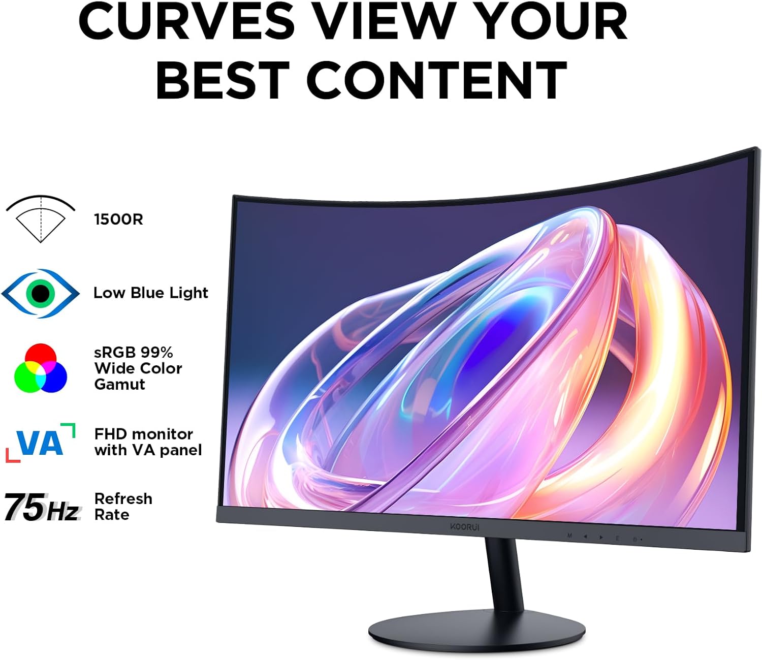 【 FHD 1500R Curved Monitor 】- KOORUI curved monitor using a 23.6” VA screen, delivers 1920 x 1080 at 75Hz breathtaking viewing quality. The 1500R degree curved design immerses you completely into the working landscape, screen curvature as the images appear to wrap around you for an in depth, immersive experience