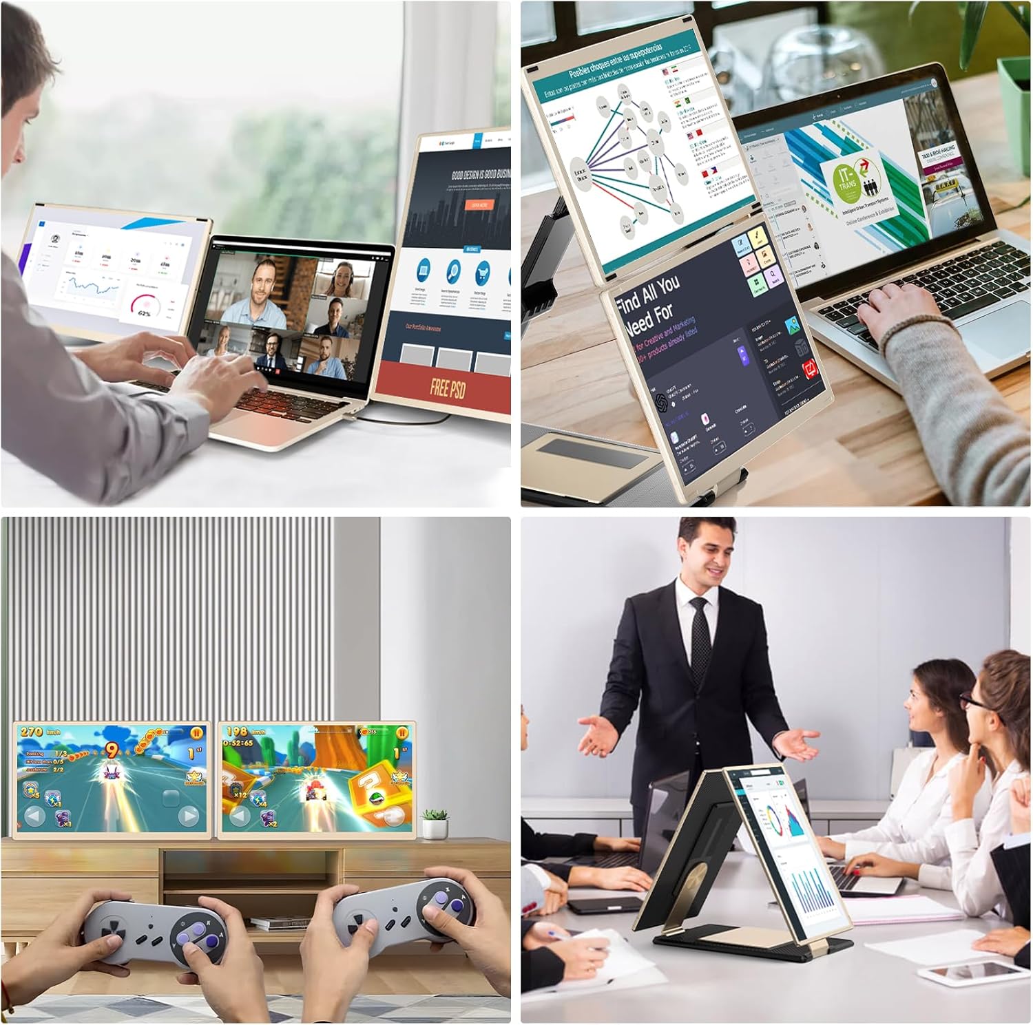 【PORTABLE & CONVENIENT USING】This triple monitor for a laptop can be folded 0-180° each screen, the back is designed with a foldable stand, you can adjust the angle to work as your favorite, stability, convenience, and custom. It also comes with a leather bag, lightweight and easy to carry suitable for use anywhere, whether you’re office, traveling, business trip, or working at home, easy to build your efficient workstation.