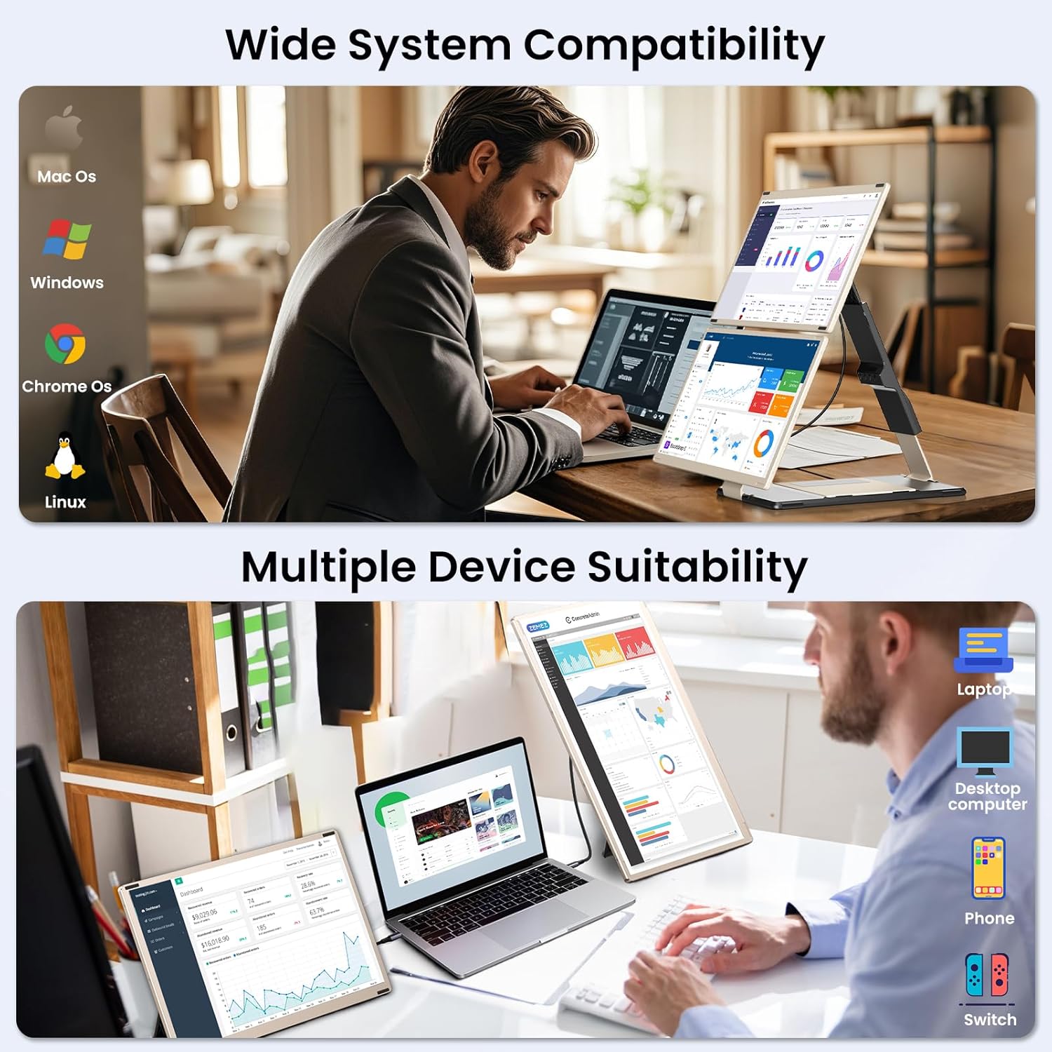 【WIDE COMPATIBILITY】Our laptop monitor extender works from 13.3” to 17” laptops. Compatible with Windows, MacOS(except for M1/M2/M3 chips), Chrome, Dex, Linux, PS4. TIPS: It does NOT compatible with Macbooks with M1 or M2/M3 chips, and it supports Macbook M1/M2/M3 Pro or Max devices.