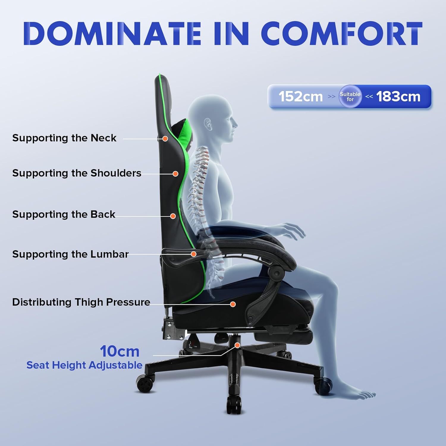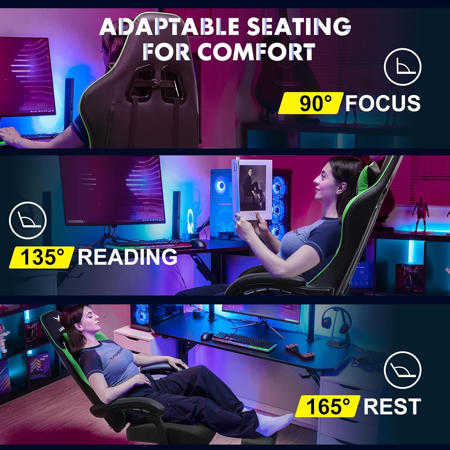 【Multi-adjustable Video Gamer Chair】 10cm Height Adjustable makes this gaming chair suitable for children, teenagers and adults; 90° – 165° Reclining Backrest adapts your different position; 360° Swivel Seat and Multi-direction Silent Caster together helps you to rotate and glide free as you like; Electronic Massage Lumbar Pillow; Adjustable Head Rest; Linkage Armrest.