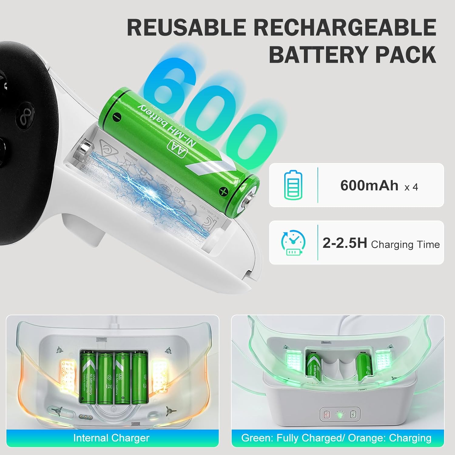 【VR Stand & 4 Rechargeable Batteries】It is not only a charging station but also a lovely VR stand for storage Quest 3 headset and controllers. Does not occupy desktop space. The Quest 3 charging dock comes with 4 x 600 mAh rechargeable controller batteries. Shortening the charging time, and reducing the waiting time. High speed quest 3 charging stand, will bring you a better gaming experience.