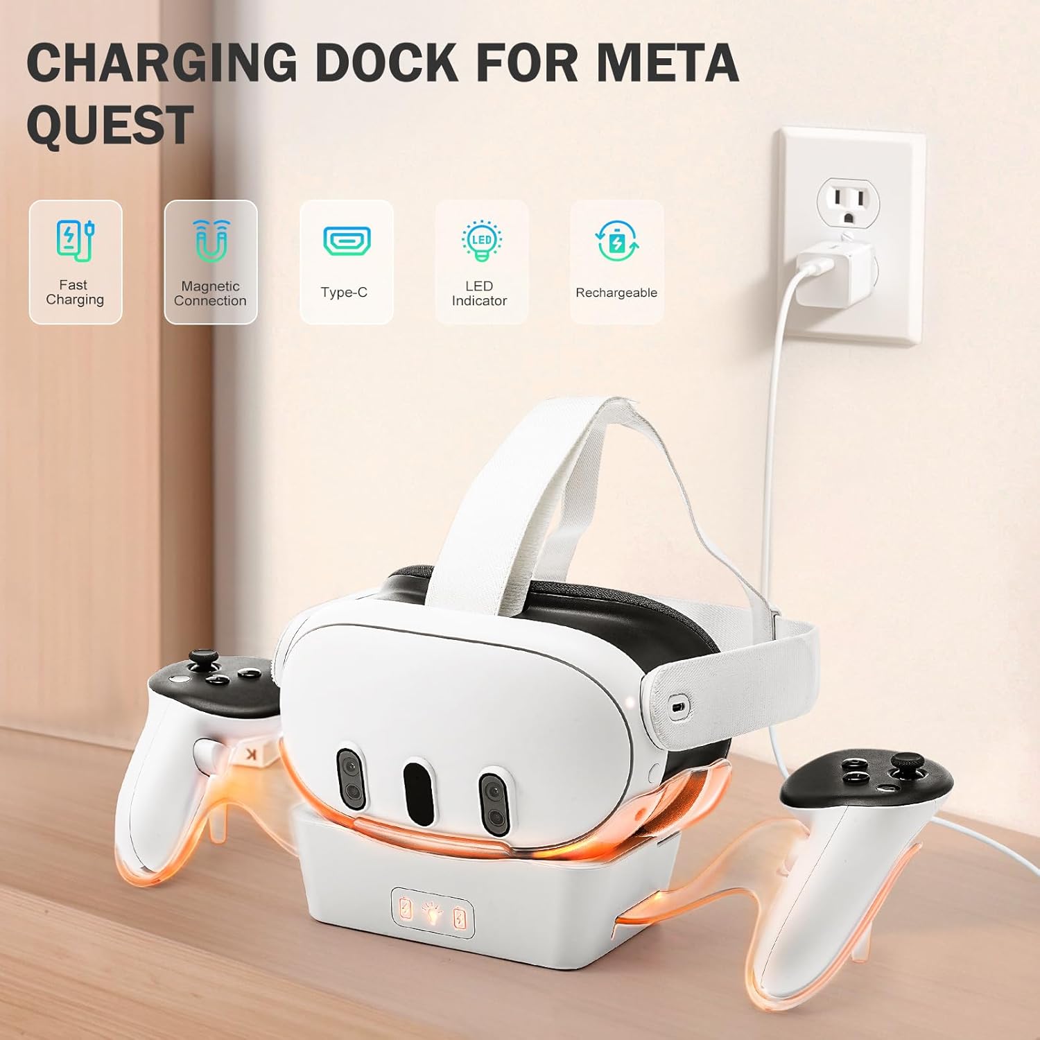 【Strong Magnetic Design & Safe Charging】The headset is charged by magnetic suction, can be charged automatically just by placing them on the charging dock. Super strong magnet to avoid disconnecting, make more secure and stable when in use. Charging Dock for Meta Quest 3 is designed with safety in mind, featuring multiple protections to shield your devices from overheating, overcharging, and short circuits, no harm to your VR headset.