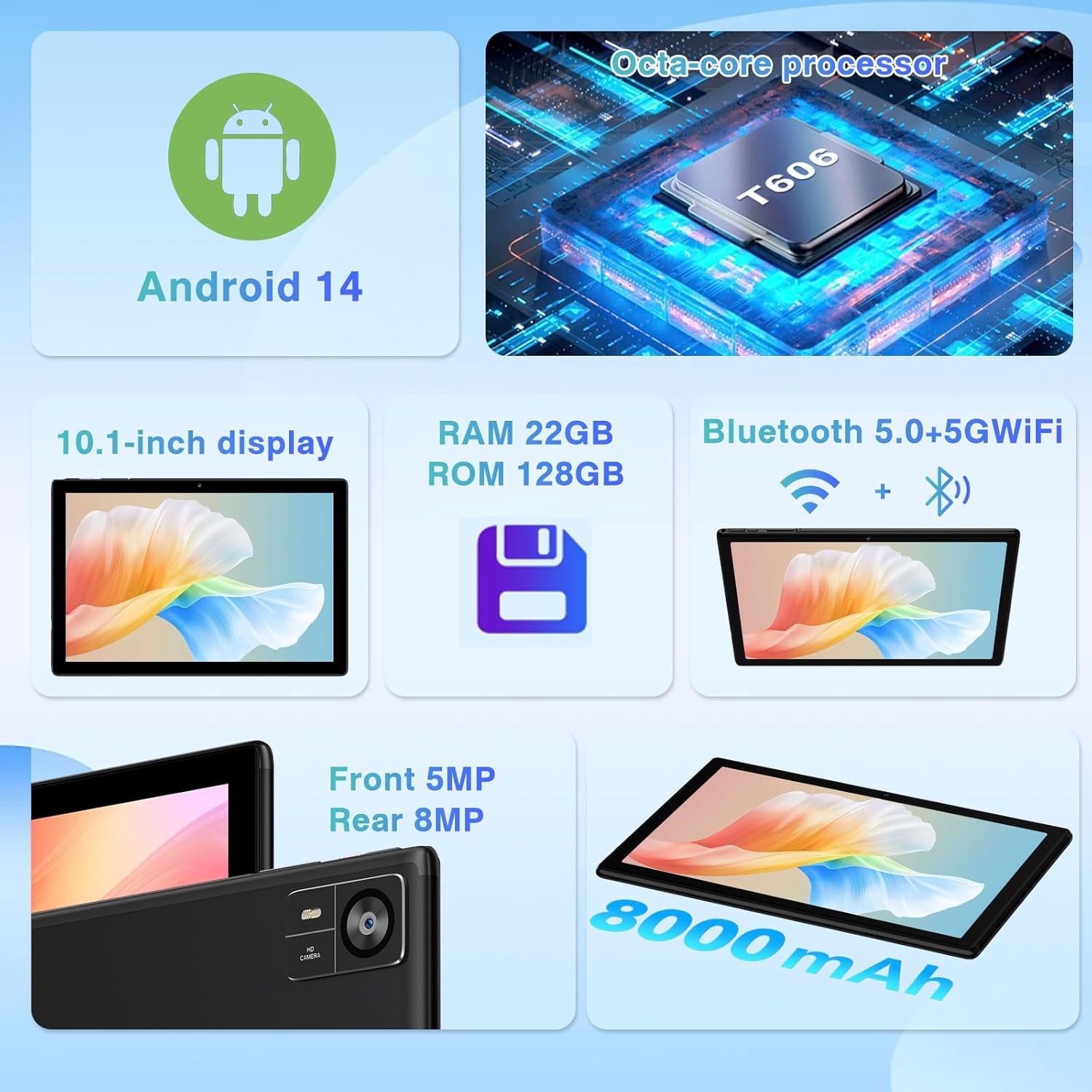 System Android 14 Processor Octa-core processor Screen 10.1IPS +Widevine L1 +Neflix HD Dual Cameras 8 MP Rear Camera + 5 MP Front Camera