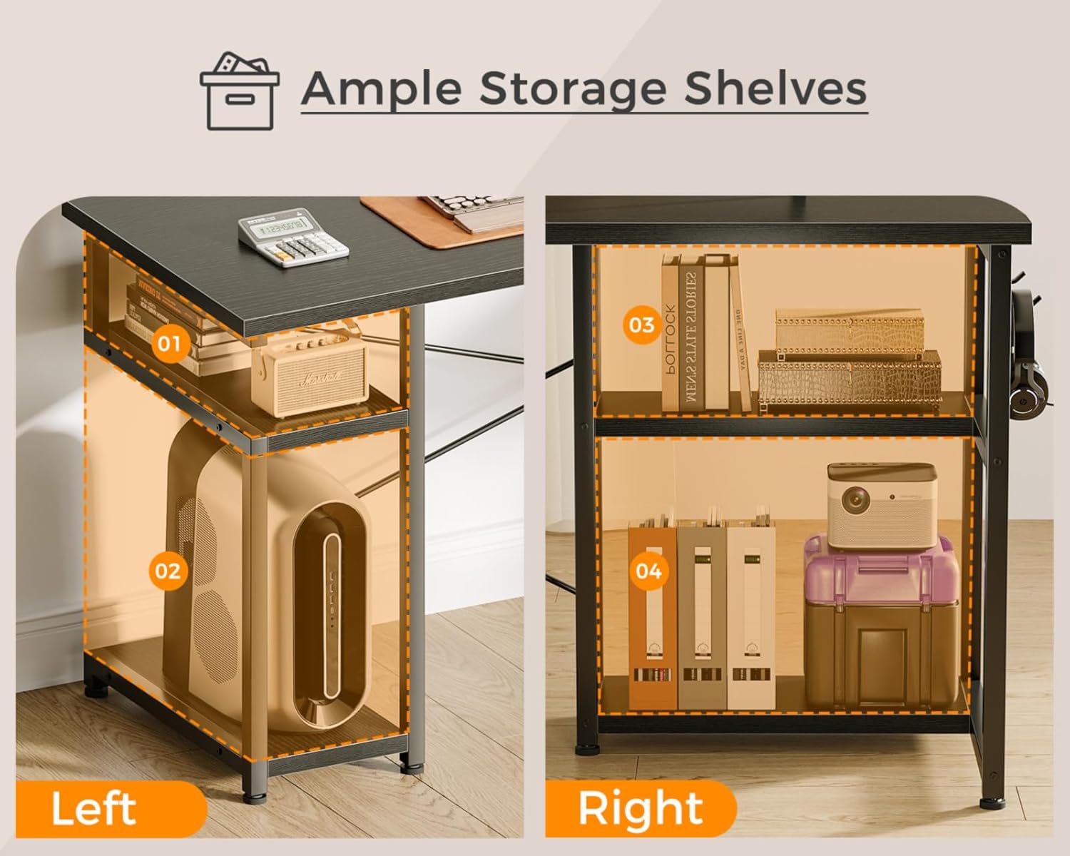 Spacious L Shaped Desktops Design: The corner computer desk experiences two large desktops of varying lengths, ideal for accommodating 2-3 monitors or screens and providing a spacious surface to accommodate your computers, books, plants, printers, laptops, keyboards, and other daily essentials.