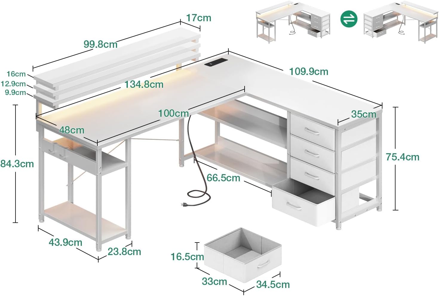 【Reversible L-Shaped Corner Desk】 The l shaped desk fits perfectly in all corners of your room, and it makes the most of limited space. The classic color scheme will match well with your bedroom, living room, office, workstation, dormitory, game room, children’s room and is also a good gift choice.