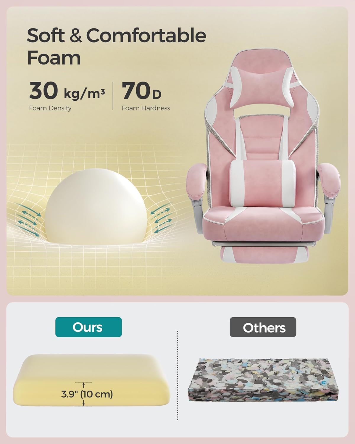 [Details Matter a Lot] The interior of the seat, backrest, and lumbar support is padded with premium high density foam that won’t easily deform; no matter for work or play, the ergonomic backrest mimics the curves of your body, providing continuous support