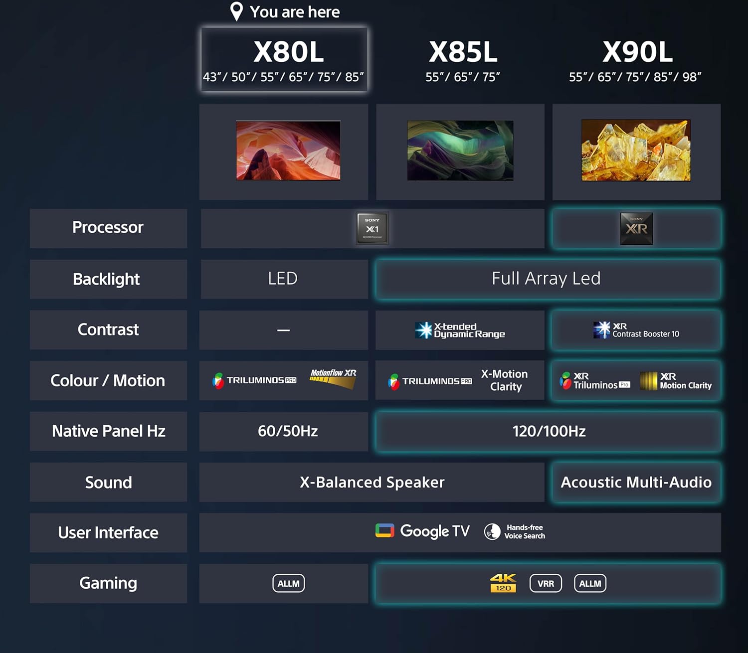 Your everyday entertainment, upgraded. This is the Sony BRAVIA X80L TV. Featuring our ultra-wide Triluminos Pro colour palette, you’ll see shades and hues on the X80L that you won’t find on other TVs. Our X1 Processor is the power behind these bright, colourful pictures, analysing content in real-time, and enhancing everything you watch. The sound is delivered by our unique X-Balanced Speaker Unit for a thrilling, high-quality audio experience, with powerful bass. Minimalist and timeless, the TV has been designed to suit any interior. The Flush Surface Bezel keeps your focus on the picture and the two-way stand offers ultimate convenience, fitting both wide and narrow furniture surfaces. Thousands of movies are waiting for you on the BRAVIA CORE app! Exclusively for BRAVIA TV owners, you’ll gain access to the Sony Pictures Entertainment library filled with the latest blockbusters and classics, watch in Pure Stream (the highest in streaming quality), enjoy the largest available collection of IMAX Enhanced movies, and be treated to behind-the-scenes Studio Access. When you buy the X80L, you can choose 5 movies to redeem in up to 4K HDR quality, and enjoy 12 months of unlimited streaming. A great TV for gamers, the X80L recognises when a console is connected and powered on, automatically switching to Auto Low Latency Mode in HDMI 2.1 so you can enjoy smoother, more responsive gameplay. In high contrast scenes, you’ll be able to see the crucial details in the darkest and brightest parts of the screen, thanks to our Auto HDR Tone Mapping technology. With Auto Genre Picture Mode, you won’t need to worry about adjusting your settings as you switch between different types of entertainment. Our new dedicated Gaming Menu allows you to optimise your gaming performance – quickly. It includes Motion Blur Reduction, a Black Equaliser, Crosshair (available in six different styles), and Custom Screen, that allows you to maximise your view when you need to see more detail in every corner of a game and minimise it when you need your eyes to focus on the enemy with laser vision! You’ll access 700,000+ movies and TV episodes from across your streaming services on this Google TV, and everything is organised into topics and genres to suit your personal interests. Set aside your remote and control the X80L hands-free! Voice Search makes life so much easier – just ask to find a specific title, search by genre, get personalised recommendations… You can even use it to control your other smart home devices, and more. You can even save up to 32% more energy with the X80L! Our new ECO Dashboard puts all of your eco settings in one place that’s intuitive and user-friendly, so you can save energy without hassle or jargon.* BRAVIA CAM (sold separately) is also compatible. From family catch-ups to important meetings on the big screen, it’ll feel like you’re in the same room, transforming your video chats, and so much more! Crunchyroll – the largest anime streaming service in the world – is included on the X80L too. With a vast library of anime, manga, and other original content, you can watch titles like “Lupin the Third,” “Attack on Titan,” and “The God of High School” on-demand on your Sony TV. The movies and shows are translated and subtitled or dubbed, so you can enjoy in a variety of languages. Dolby Atmos and Dolby Vision are two technologies often associated with big movie theatres, found on this X80L TV, giving all of your favourite movies, TV shows, sports, and games, the all-star treatment! Dolby Vision unlocks the full potential in every scene, infusing pictures with ultra-vivid colour, sharper contrast, and deep texture. Dolby Atmos is the immersive sound to match, bringing all your entertainment to life in surround sound style.