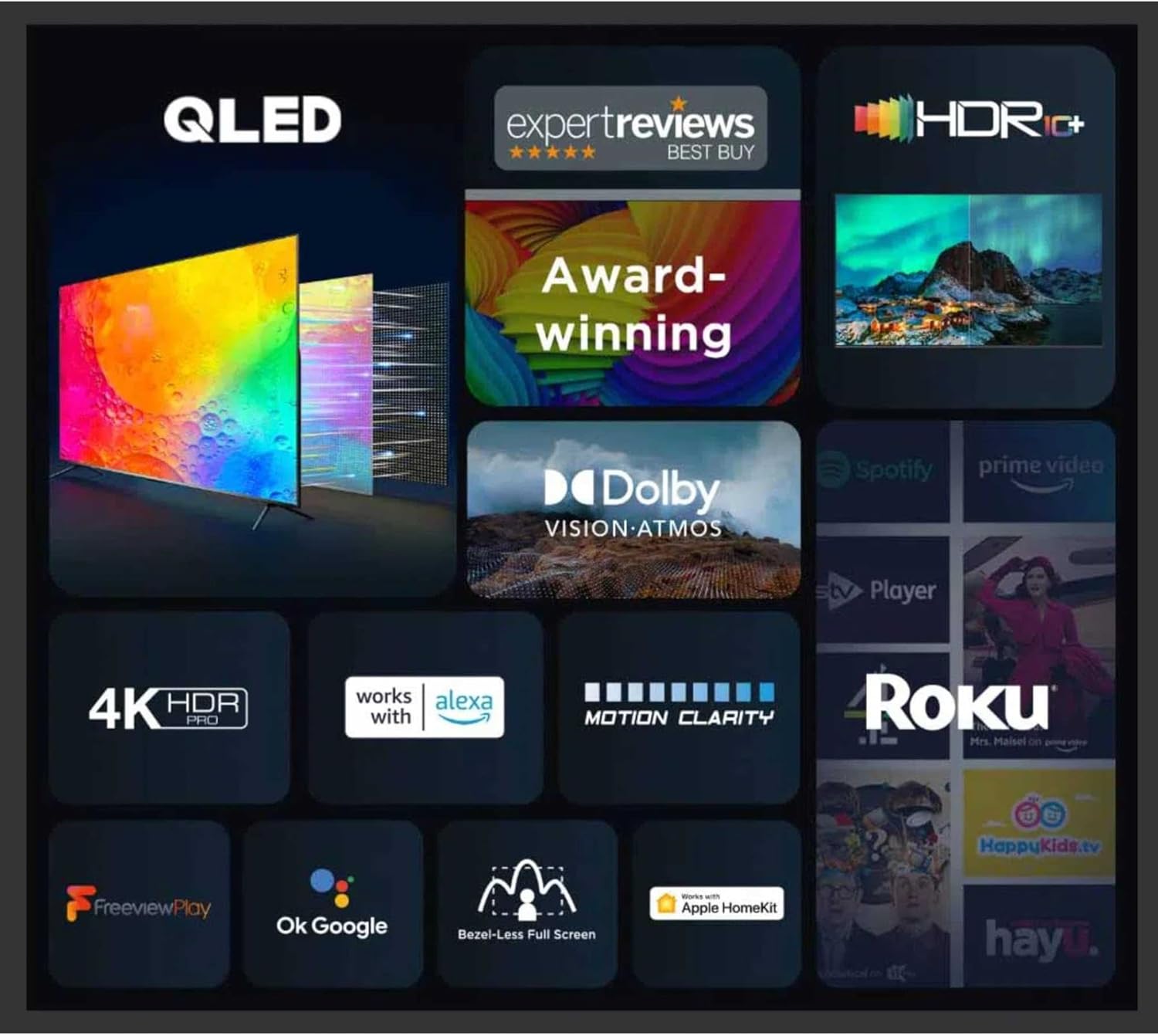TCL Roku TV RC630K – More than a Smart TV—a better TV TCL Roku TV RC630K Series combines QLED, 4K HDR Pro, a slim contemporary design and Roku TV OS. On top, with Game Master and latest HDR formats supported (including Dolby Vision and HDR10+) this TV is the best companion to enjoy any HDR movies, sports, and games. Powerful, feature-packed and simple-to-use, this TCL Roku TV brings all your favourite entertainment together in one place. With a simple home screen, easy-to-use remote and free automatic software updates. TCL Roku TV models are simple to use and easy to love. This TCL Roku TV works with popular voice assistants such as Alexa, Hey Google, Apple HomeKit and Apple AirPlay.