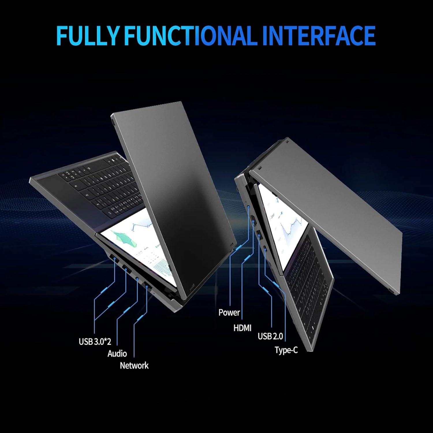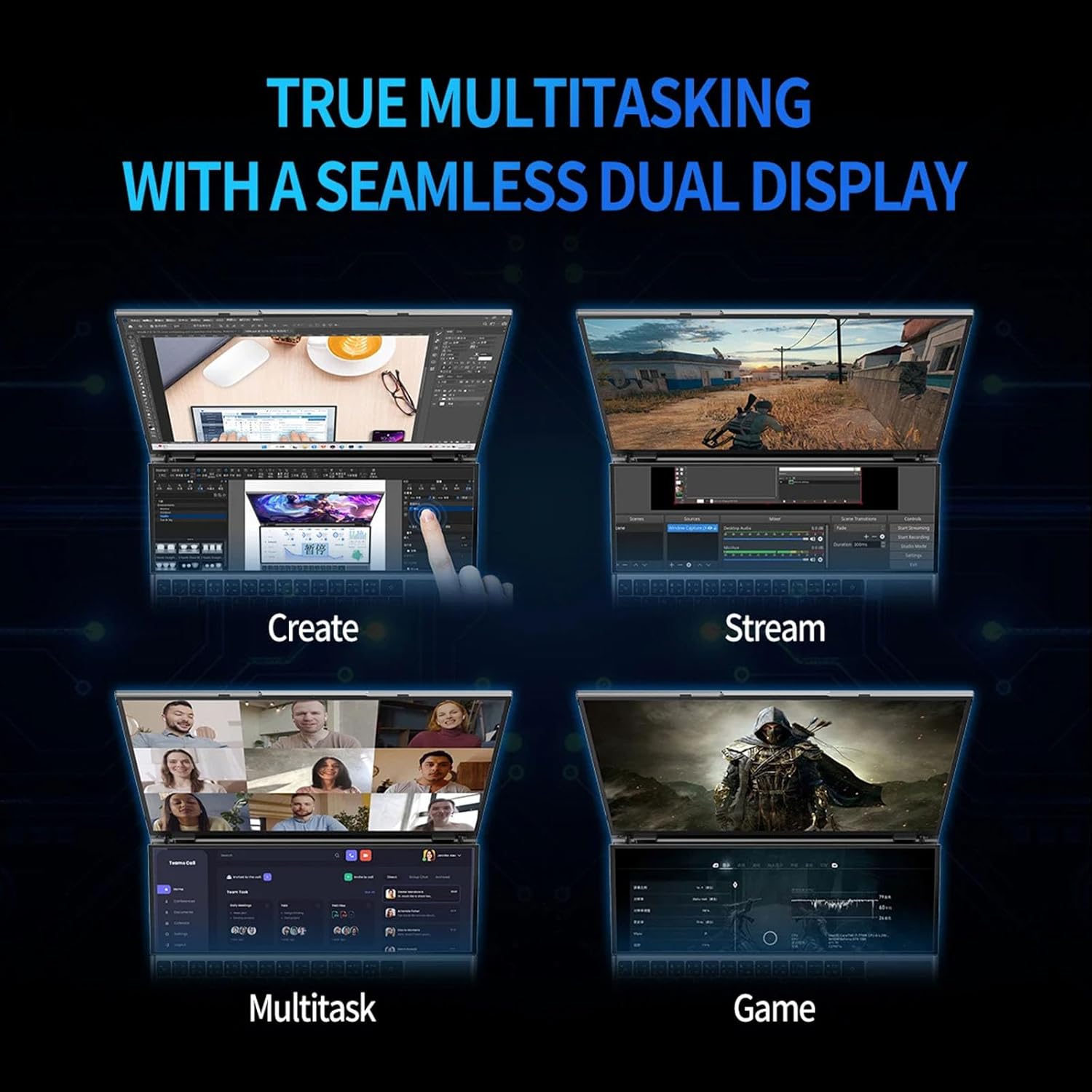 16 inch 1920×1080 IPS screen+14 inch 1920×550 touch screen for multi-fun play; 1MP front camera, 91.6x69mm big touch pad, full size backlit keyboard; 1000M RJ45 LAN+Dual band AC WiFi, Bluetooth4.2;