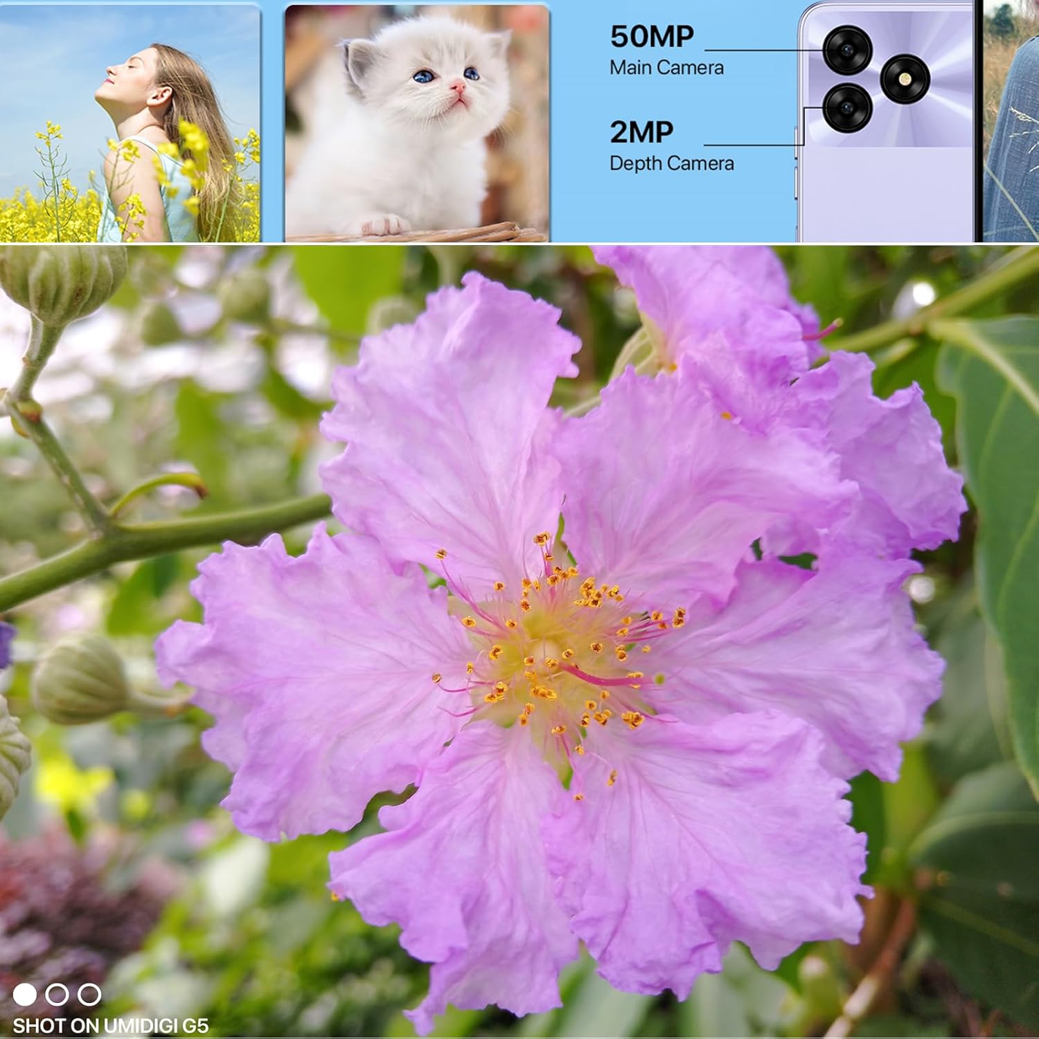 𝟓𝟎𝐌𝐏 𝐀𝐈 𝐌𝐚𝐢𝐧 𝐂𝐚𝐦𝐞𝐫𝐚+𝟖𝐌𝐏 𝐍𝐢𝐠𝐡𝐭 𝐕𝐢𝐬𝐢𝐨𝐧 𝐂𝐚𝐦𝐞𝐫𝐚: UMIDIGI G5 Android 13 phone is equipped with the main 50MP lens, which help you record the wonderful moments in clarity. For 30% improved image color fidelity. Night vision motion camera built in 8MP HD captures every touching moment of wild animals with high quality images during daytime and excellent clear images even at night. The 8MP front-facing camera accurately restores the true tones of diverse skin tones, significantly improving photo clarity and reducing digital noise. This phone also features an underwater mode, HDR, and 360° panorama, providing more surprises when taking pictures.