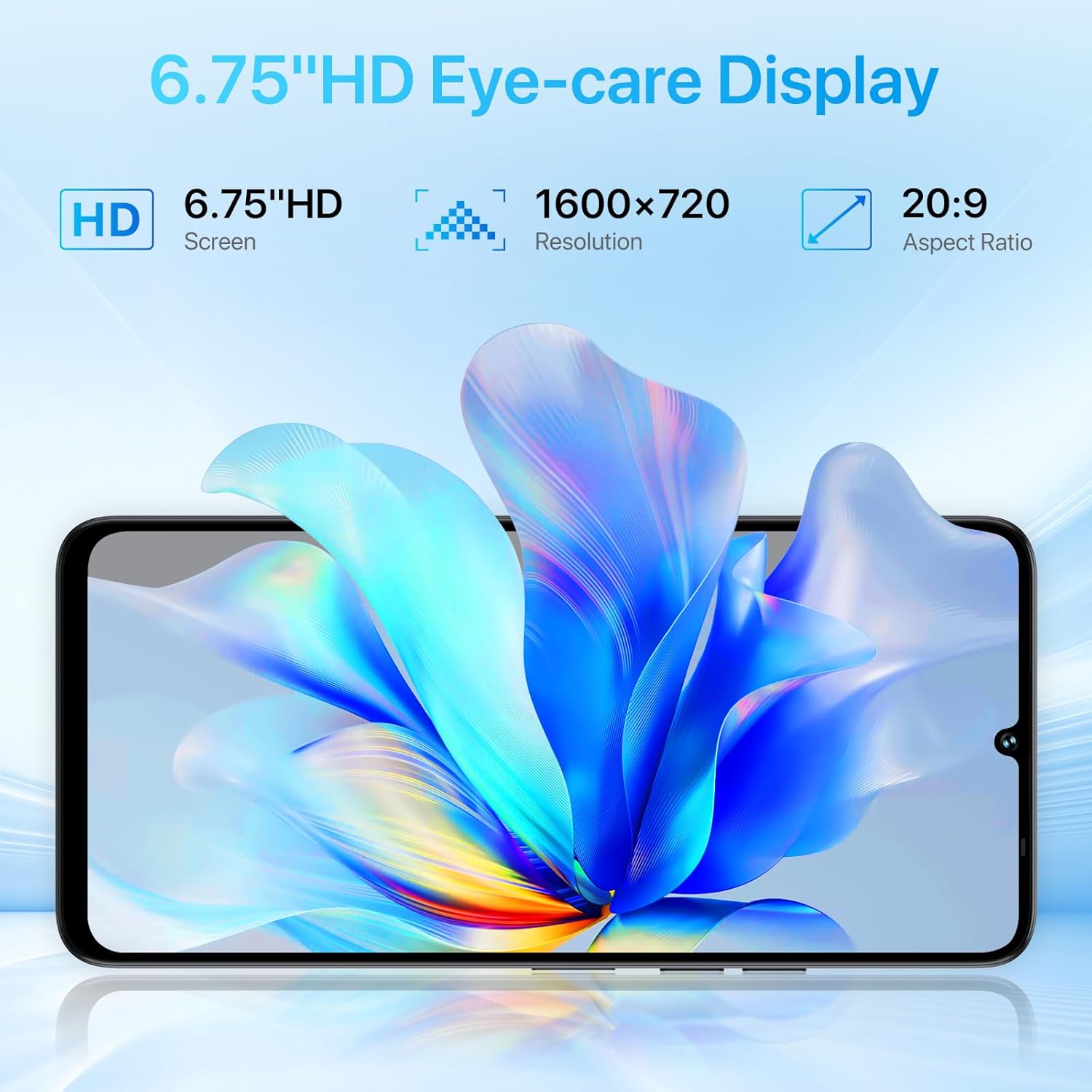 6.75 Inch Large screen Phones: Enjoy a cinematic experience with our android phone’s 6.75-inch display, 1600×720 resolution, and 20:9 aspect ratio! The screen includes eye protection features to reduce strain, providing comfortable viewing during extended gaming, reading, or streaming sessions