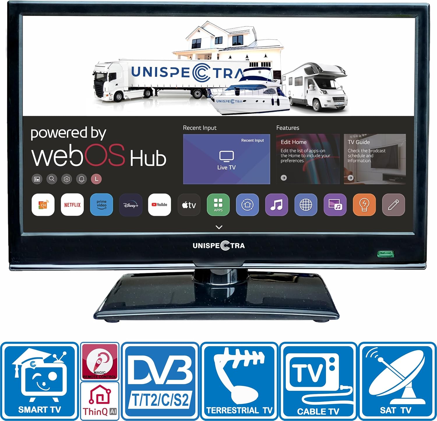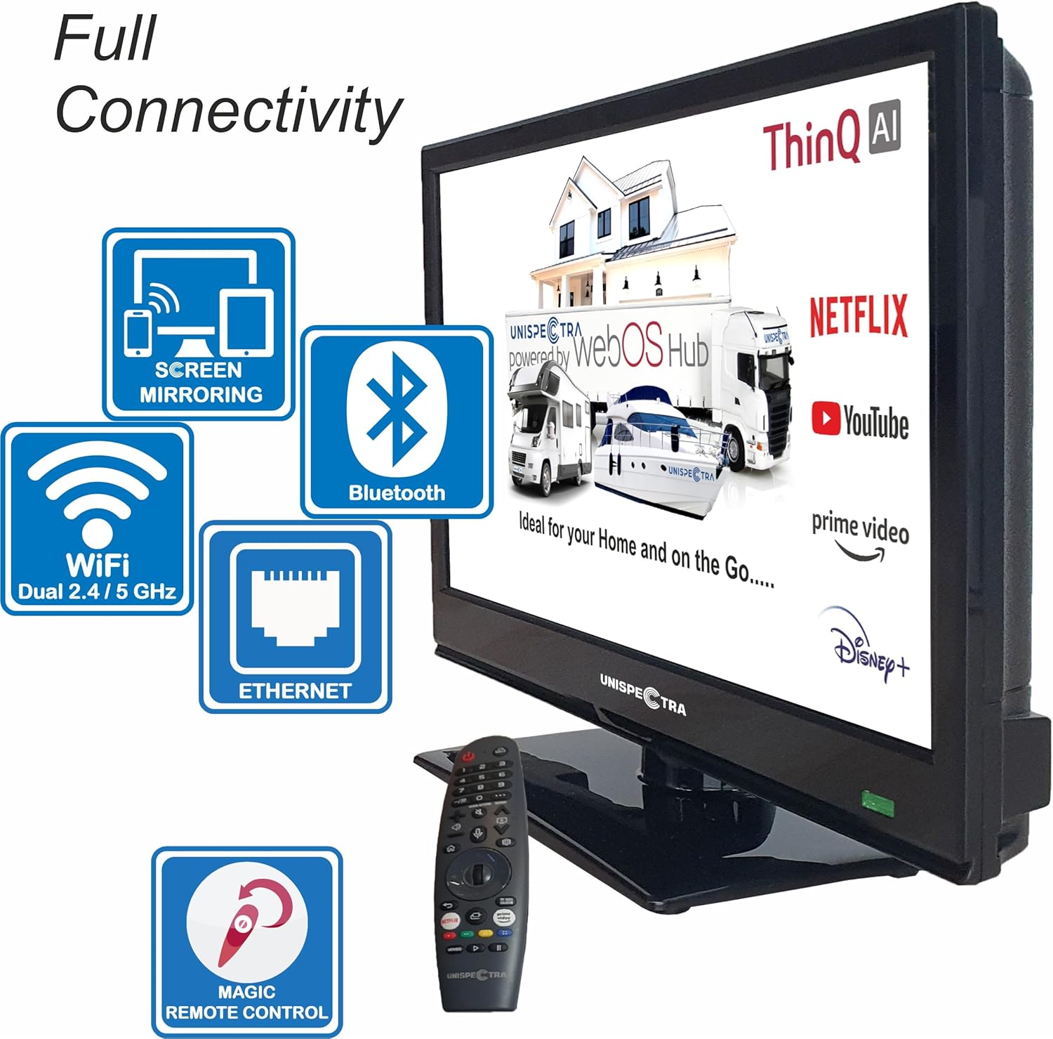 16 Inch SMART (powered by LG webOS Hub) TV with Magic Remote control. TRIPLE TUNER: DVB-T/T2 tuner for Freeview HD, and all Europe Free to Air TV. DVB-S2 tuner for Satellite HD TV. DVB-C for cable television.