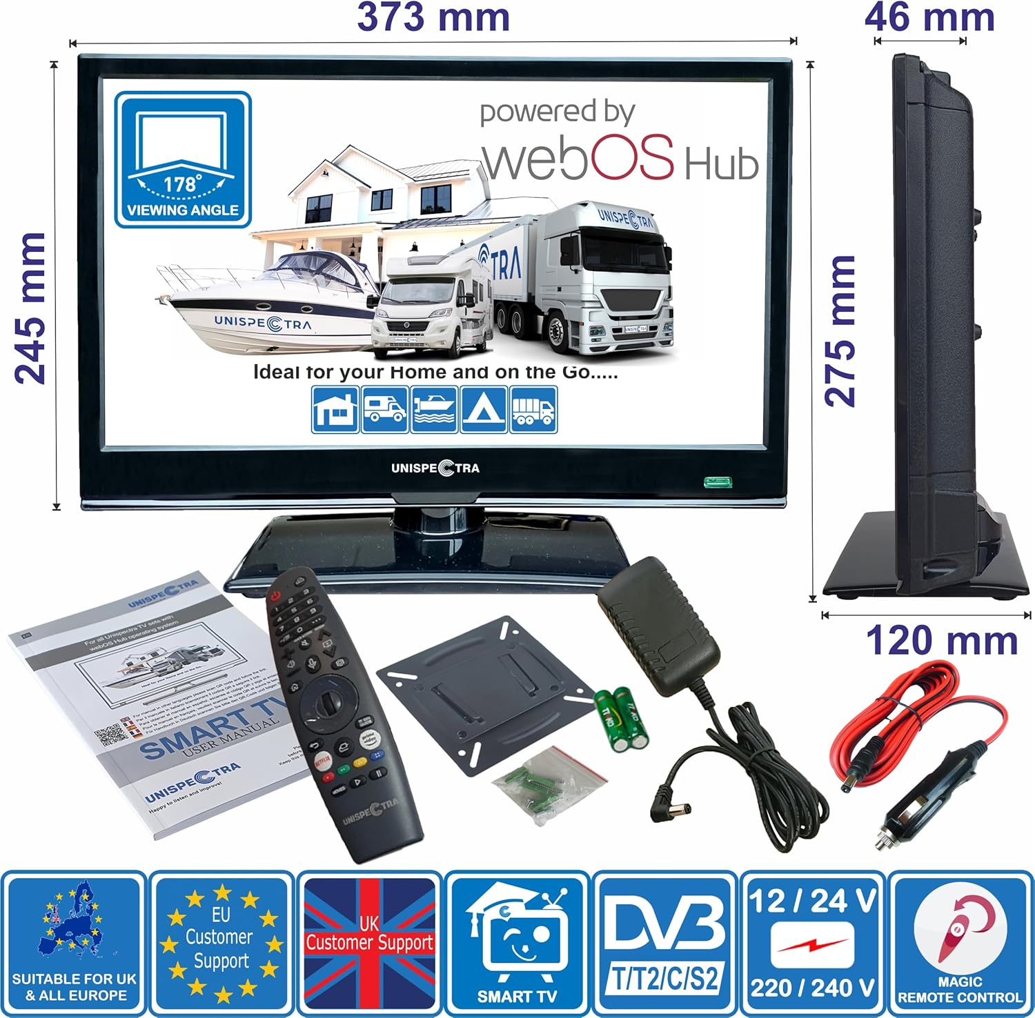 WIDE USABILITY: Suitable for all Europe and UK. Ideal for your home or on the go….Motorhome, Campervan, Caravan, Lorry, Truck, Boats, Home the TV can be powered by 12 or 24 volt DC or 240V AC (both power leads included).
