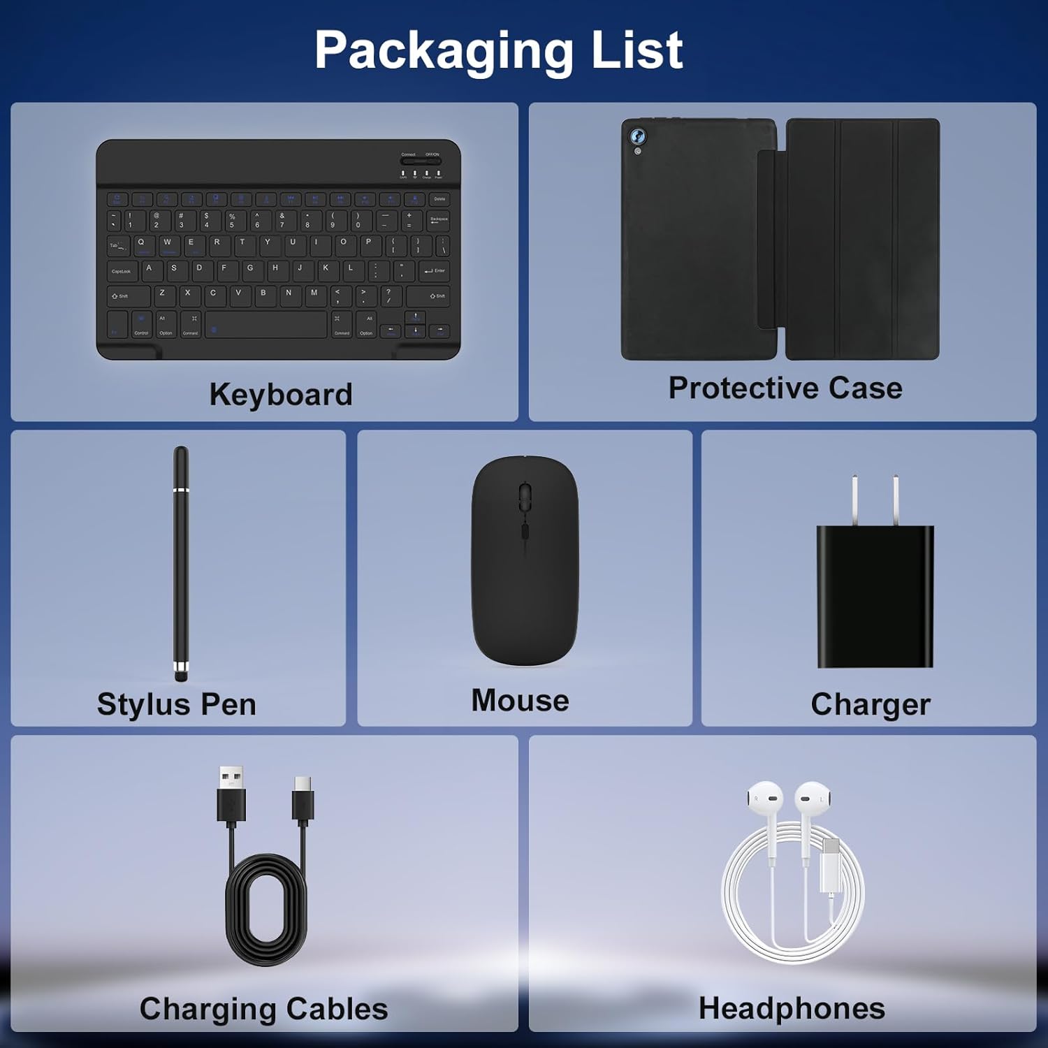 【Multi-Functional 2 in 1 Tablet】The C108 Android 14 Tablet featuring a 2-in-1 professional work mode with a Bluetooth keyboard, mouse, stylus, headset and foldable case, the C108 Android 14 Tablet is very easy to set up and connect, giving you the flexibility to convert your tablet into laptop mode or computer mode. NOTE: Mouse does not include batteries, batteries need to be purchased separately!