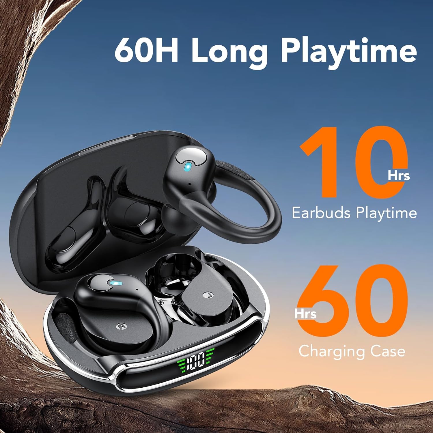 60 Hrs of Playtime and LED Digital Display: Headphones wireless last approximately 10 hours. The 650 mAh battery extends the total run time to 60 hours and provides an additional 5 recharges for the headphones.The LED indicator clearly shows how much power is left in the charging case.