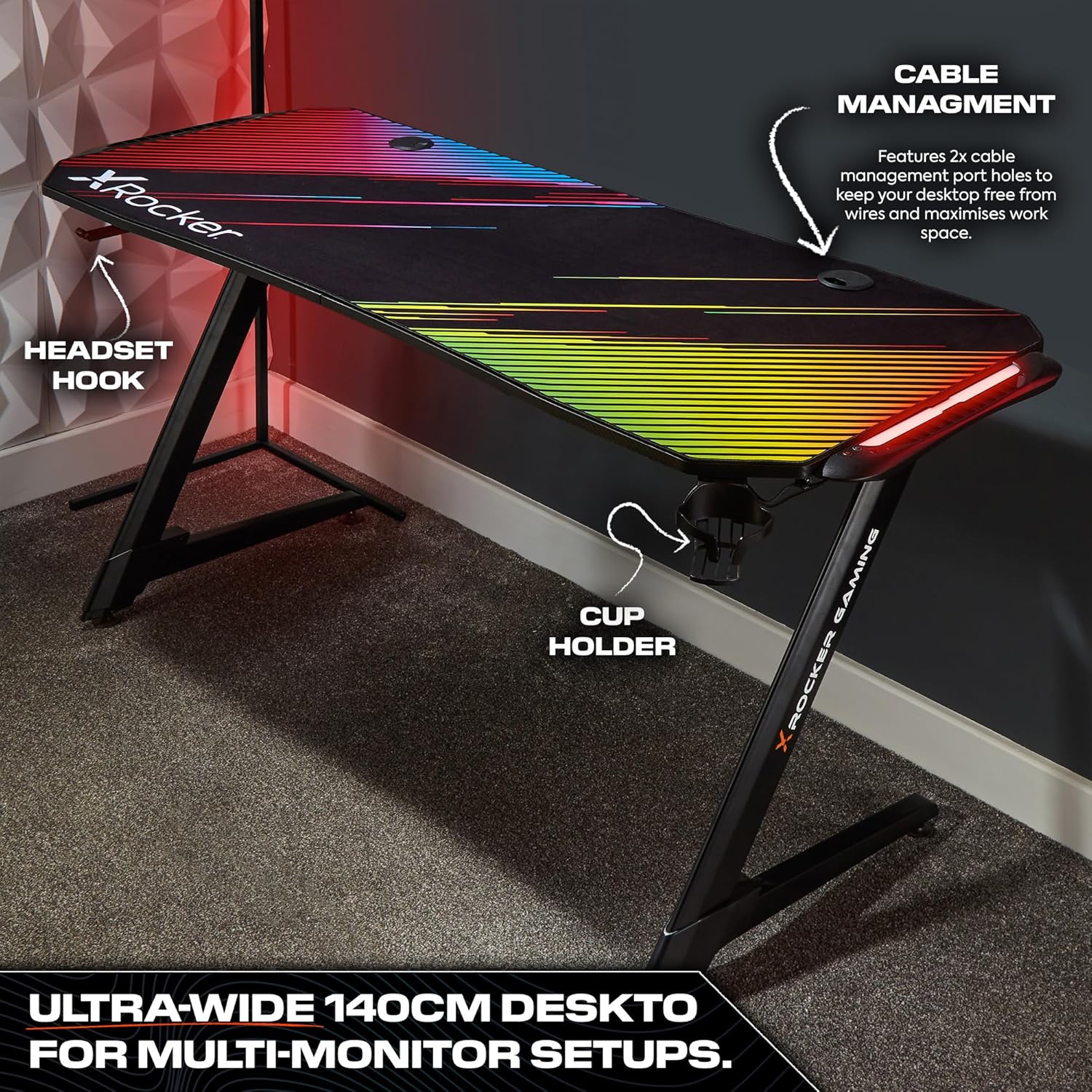 Large 140cm (excl. LED surrounds) desktop allows for multi-monitor setups with a space saving cable management system, cup holder and metal headset hook to help maximise your work space.