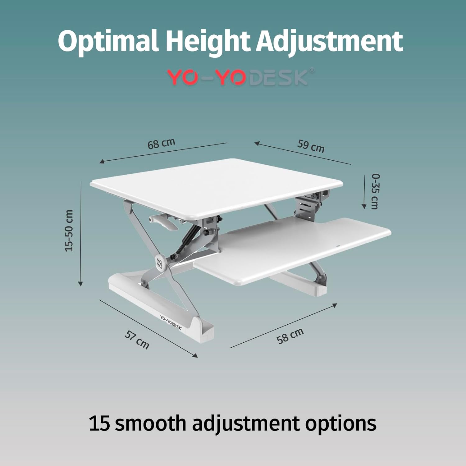 SUPERIOR HEIGHT-ADJUSTMENT: Unbeatable height extension range for stand up desk converter: 15 – 50cm (Desktop), 0 – 36cm (Keyboard). This portable standing desk has 15 options for smooth height adjustment from sitting to standing. This laptop and monitor stand split level worktop is 68cm wide.