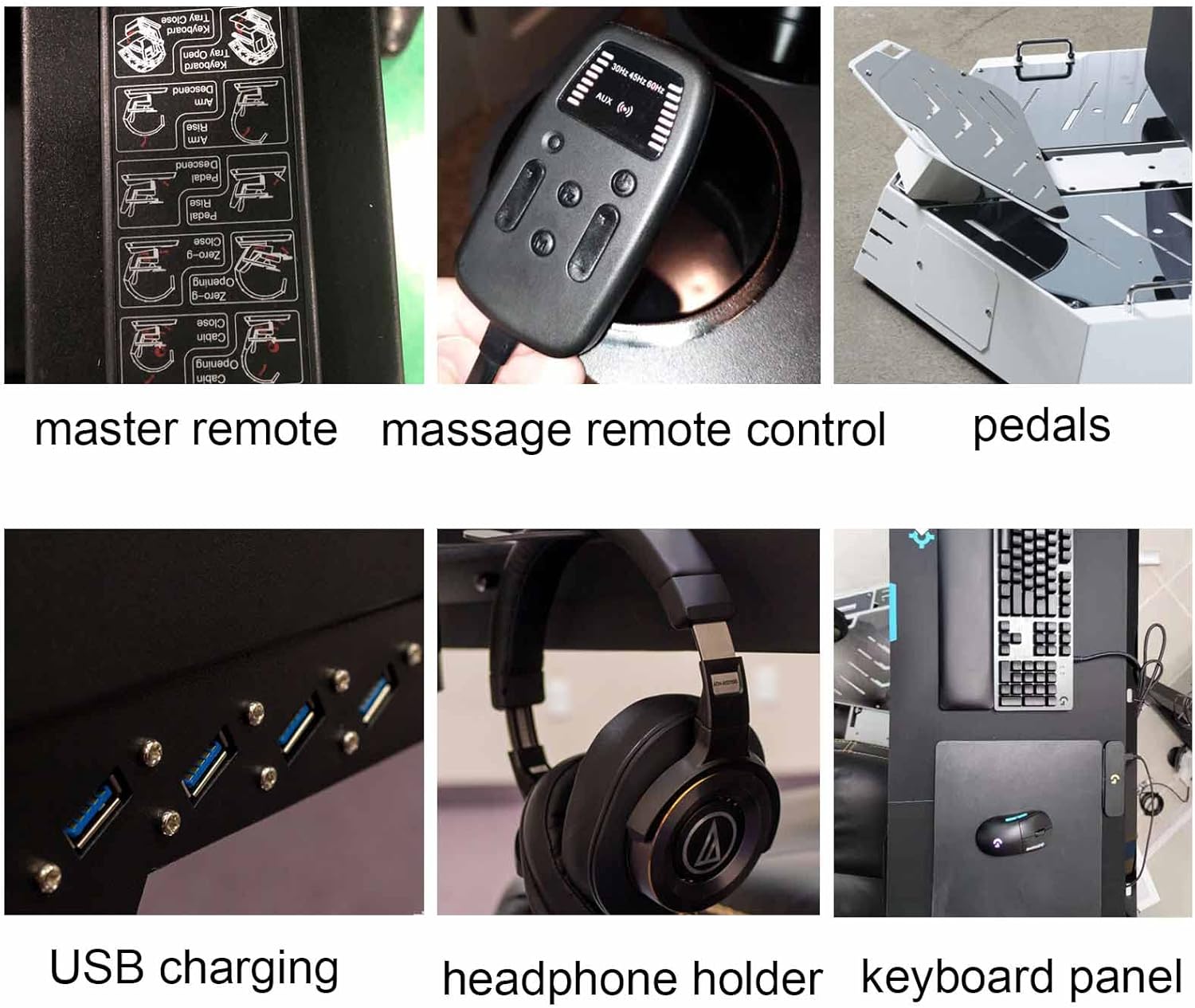 Accessories: Large keyboard tray with a size of 96x40cm is convenient enough to use a notebook; there are 4 USB2.0 ports on the armrest which are convenient for plugging in various peripherals such as mouse keyboard etc.; earphone hanger; 2 cup holders/ashtrays